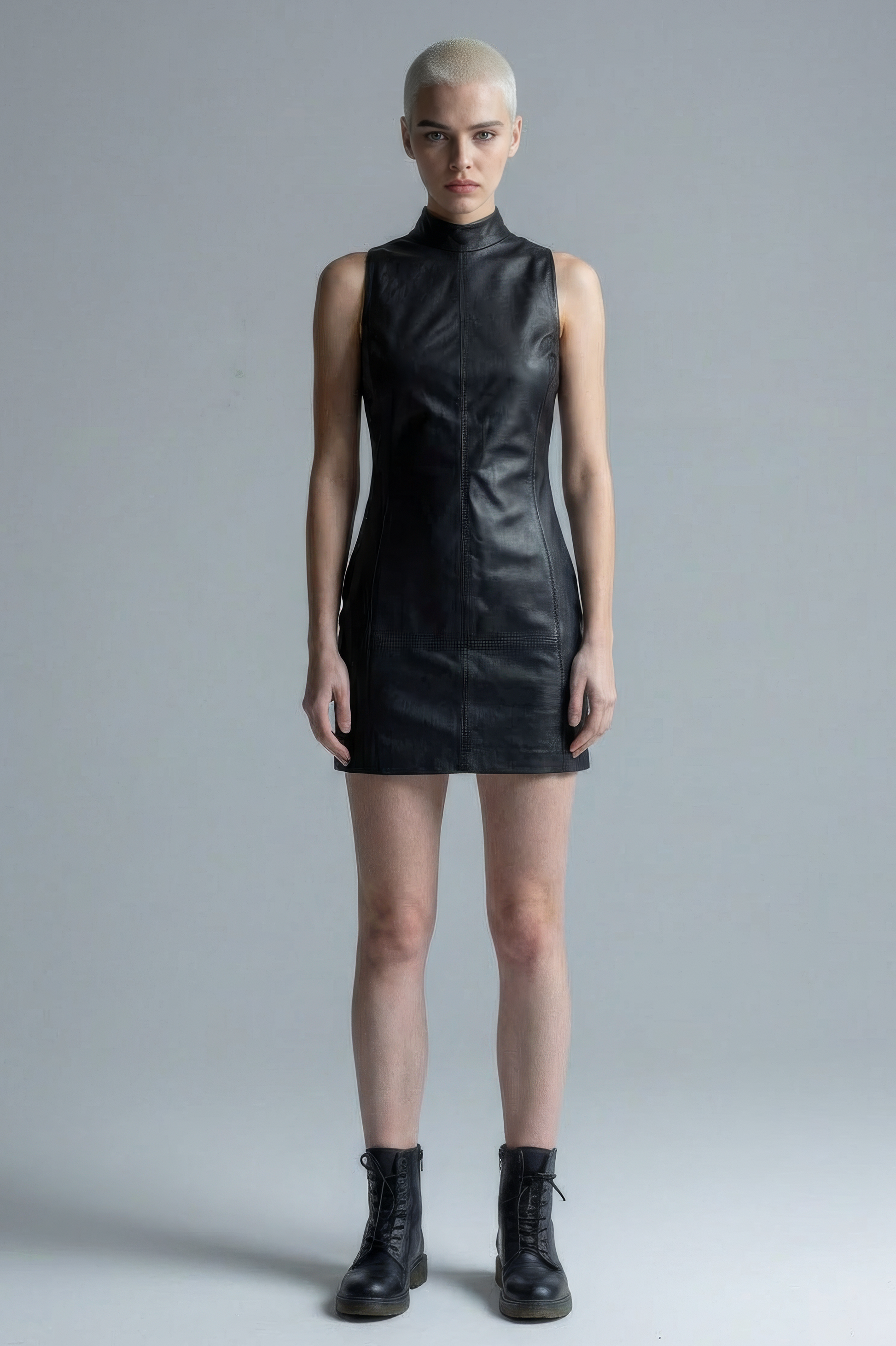 The high neckline and streamlined cut highlight the material’s structure, while subtle seam detailing enhances the form without distraction. Designed to transition effortlessly from day to night, this piece stands as a statement of confidence and understated elegance.