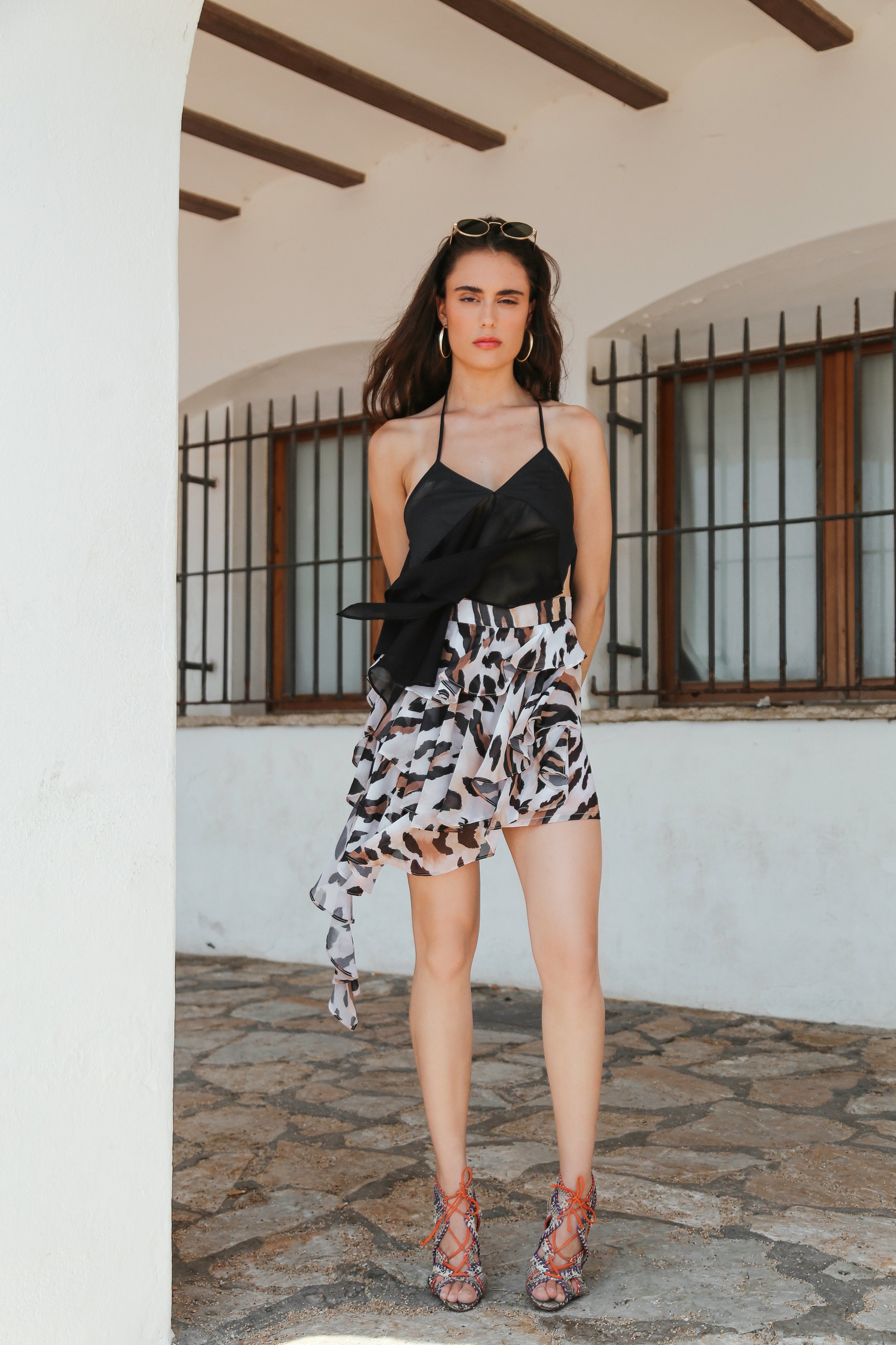 This asymmetric animal print skirt by Anakon Brand stands out for its movement and personality. With light cascading ruffles and a bold silhouette, it enhances your figure with a daring yet feminine energy. Handmade in Barcelona, it blends elegance and strength in every stitch.