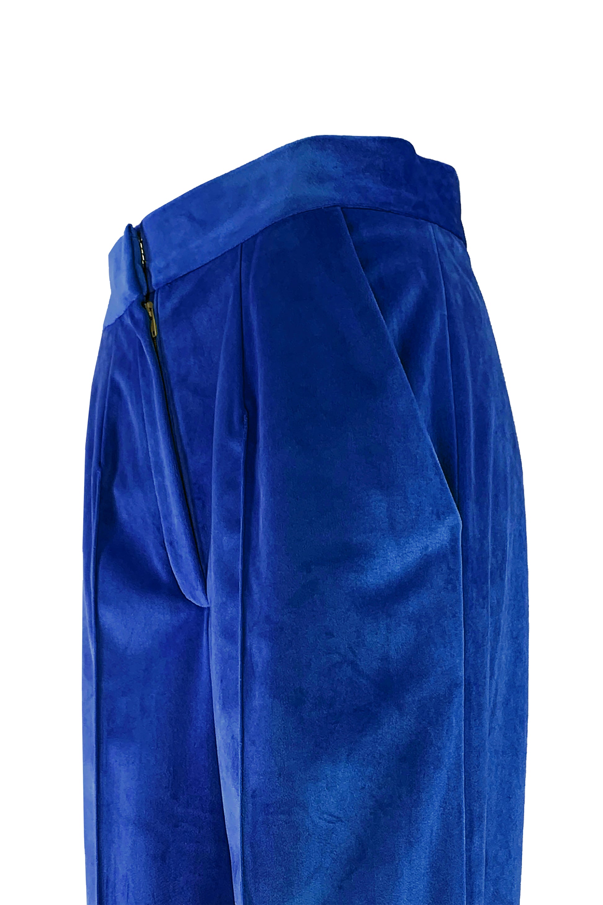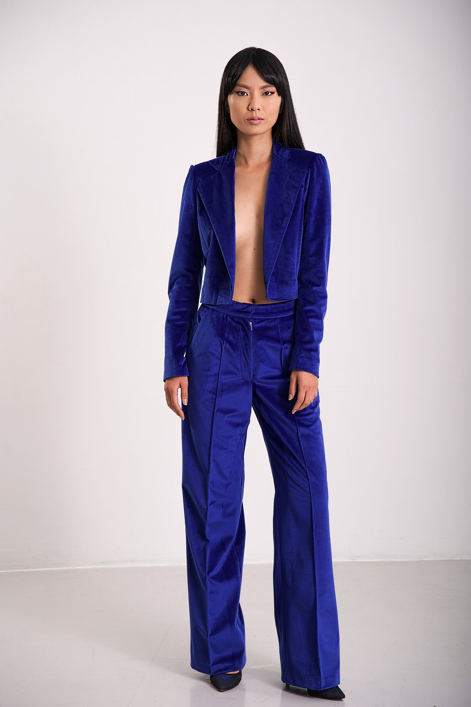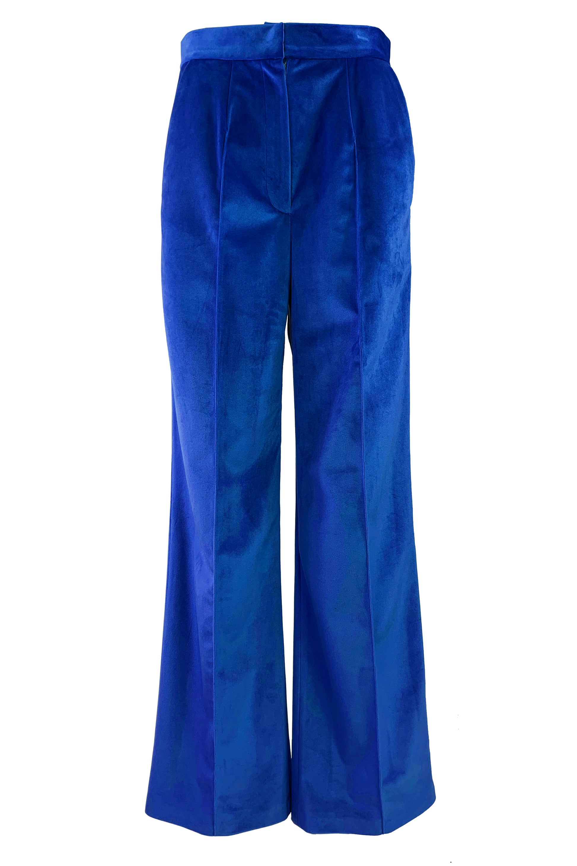 El pantalón de terciopelo azul eléctrico presenta un corte recto, dos bolsillos laterales y cierre de cremallera en la parte delantera.