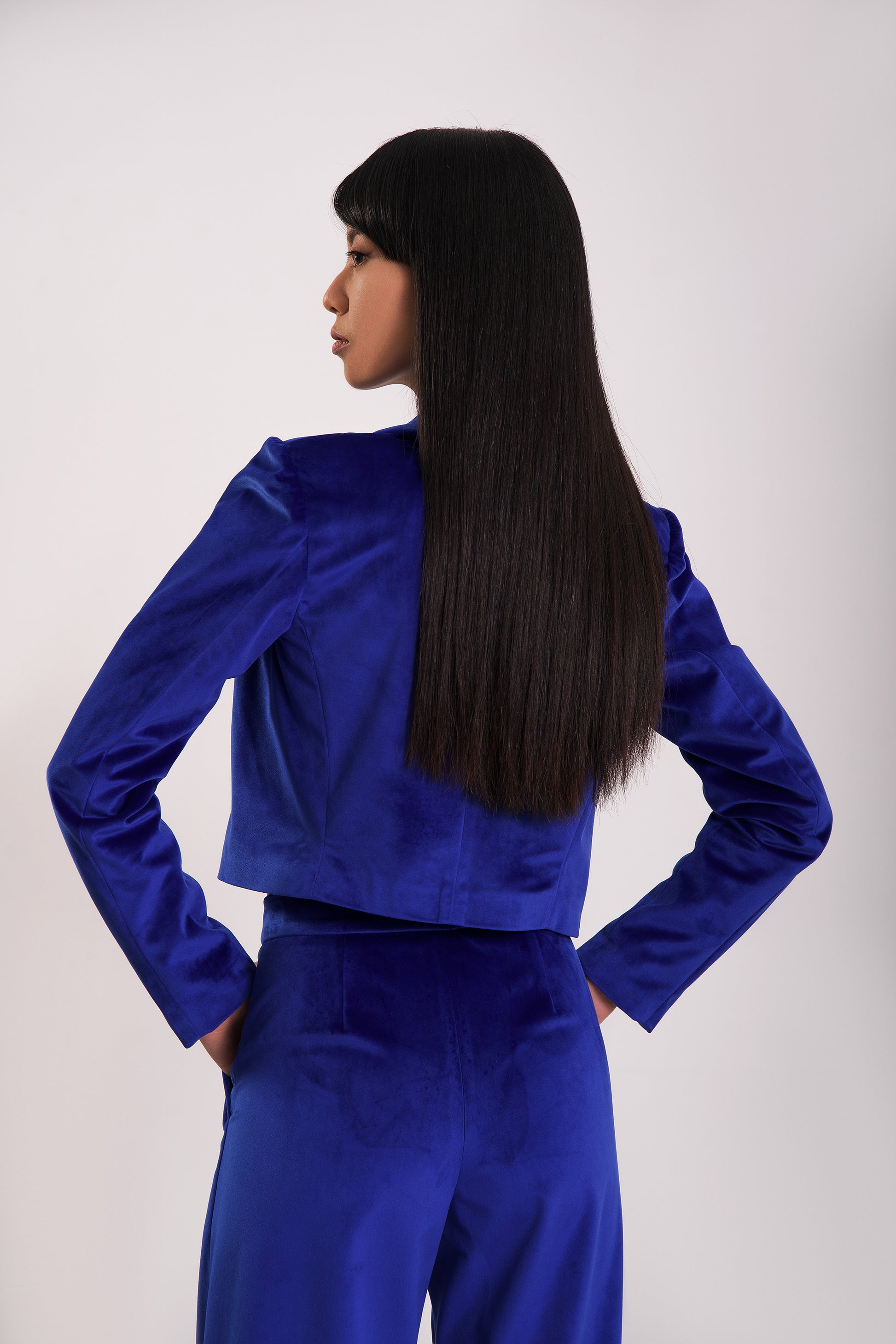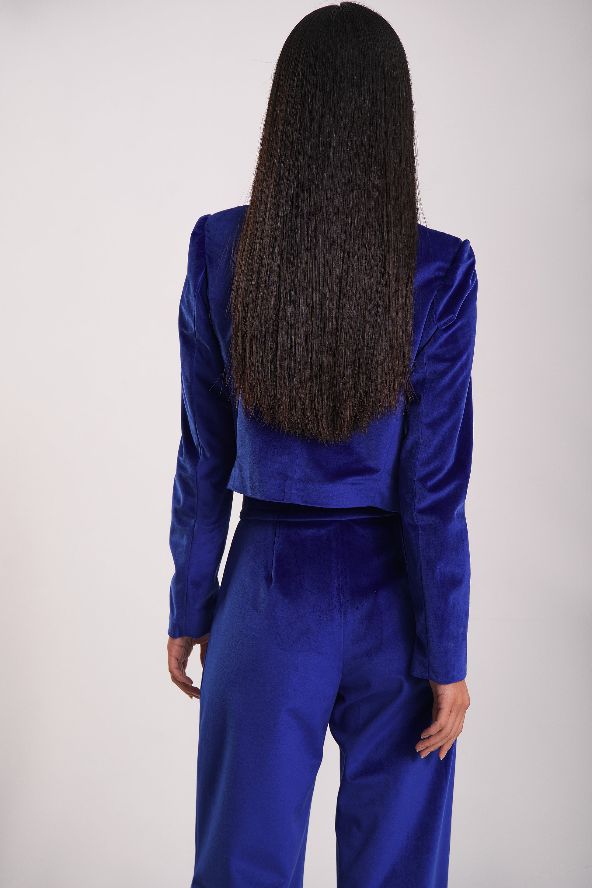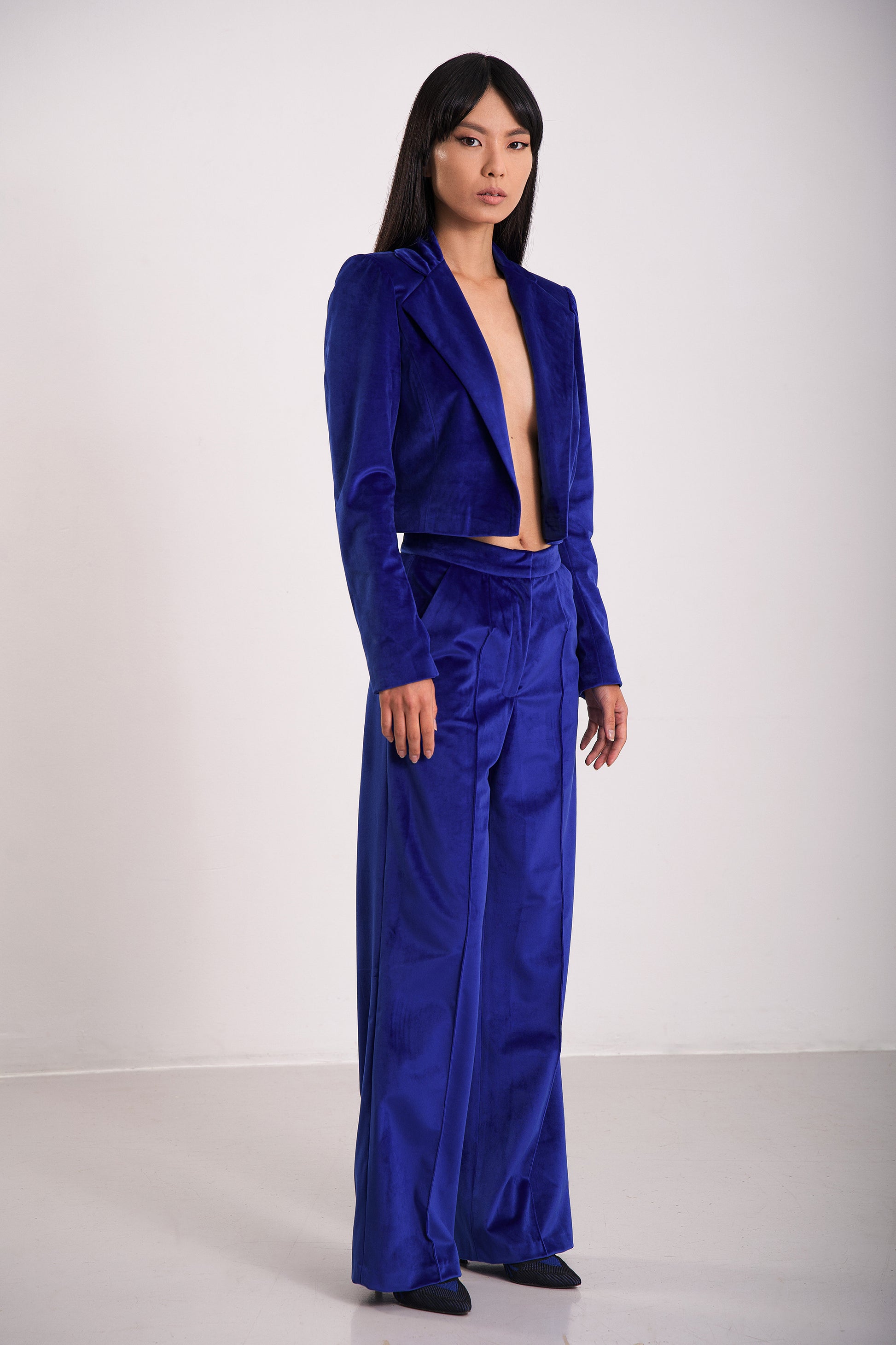 El pantalón de terciopelo azul eléctrico presenta un corte recto, dos bolsillos laterales y cierre de cremallera en la parte delantera.