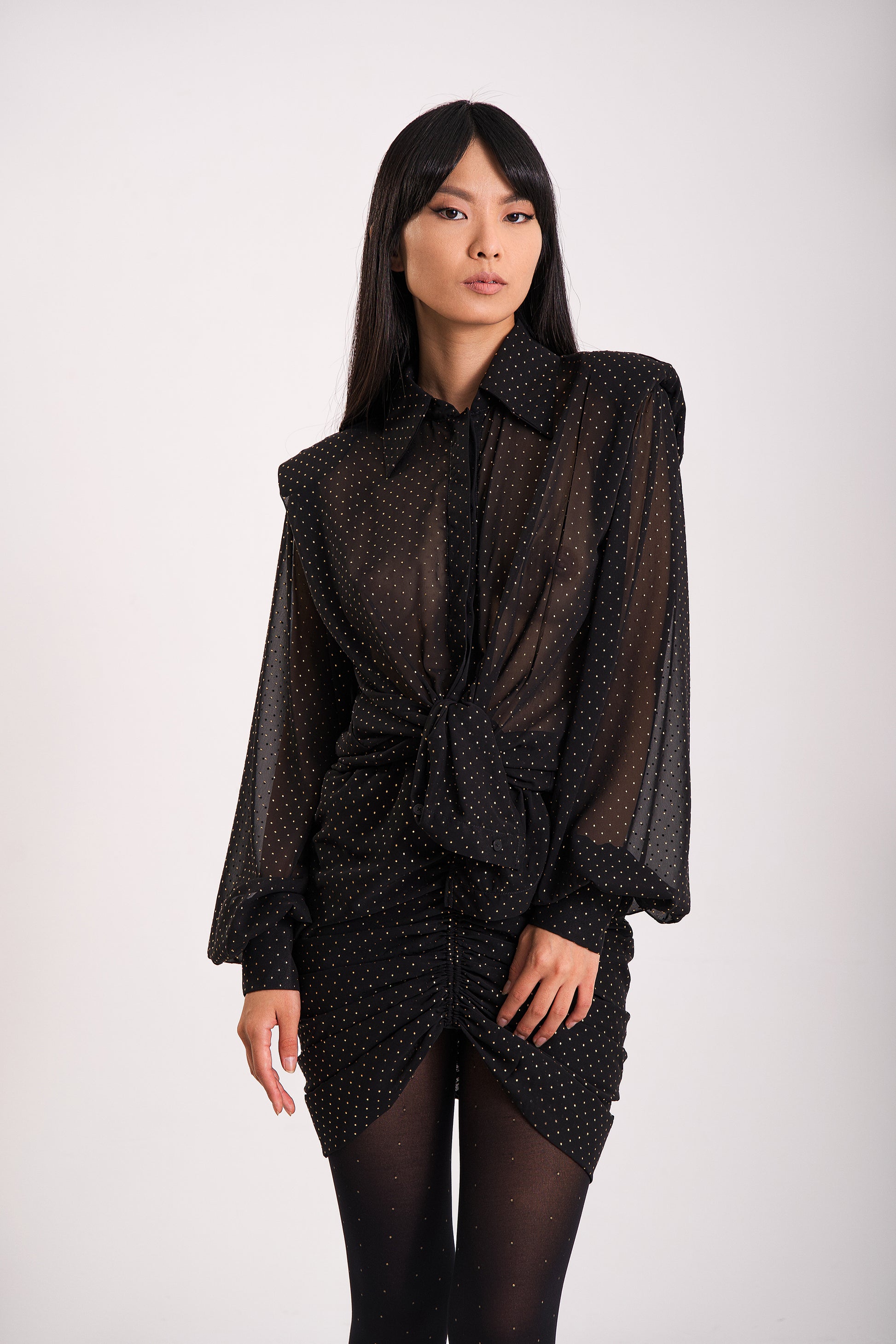 Esta falda negra es transformable. Tiene un corte ajustado, detalles fruncidos ajustables y cinturilla elástica. Puedes ajustar el largo y la orientación.