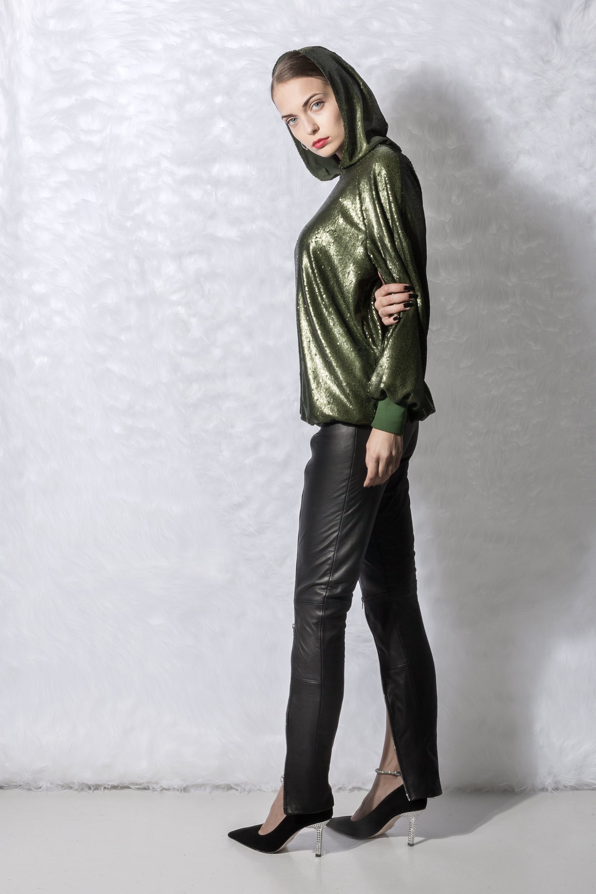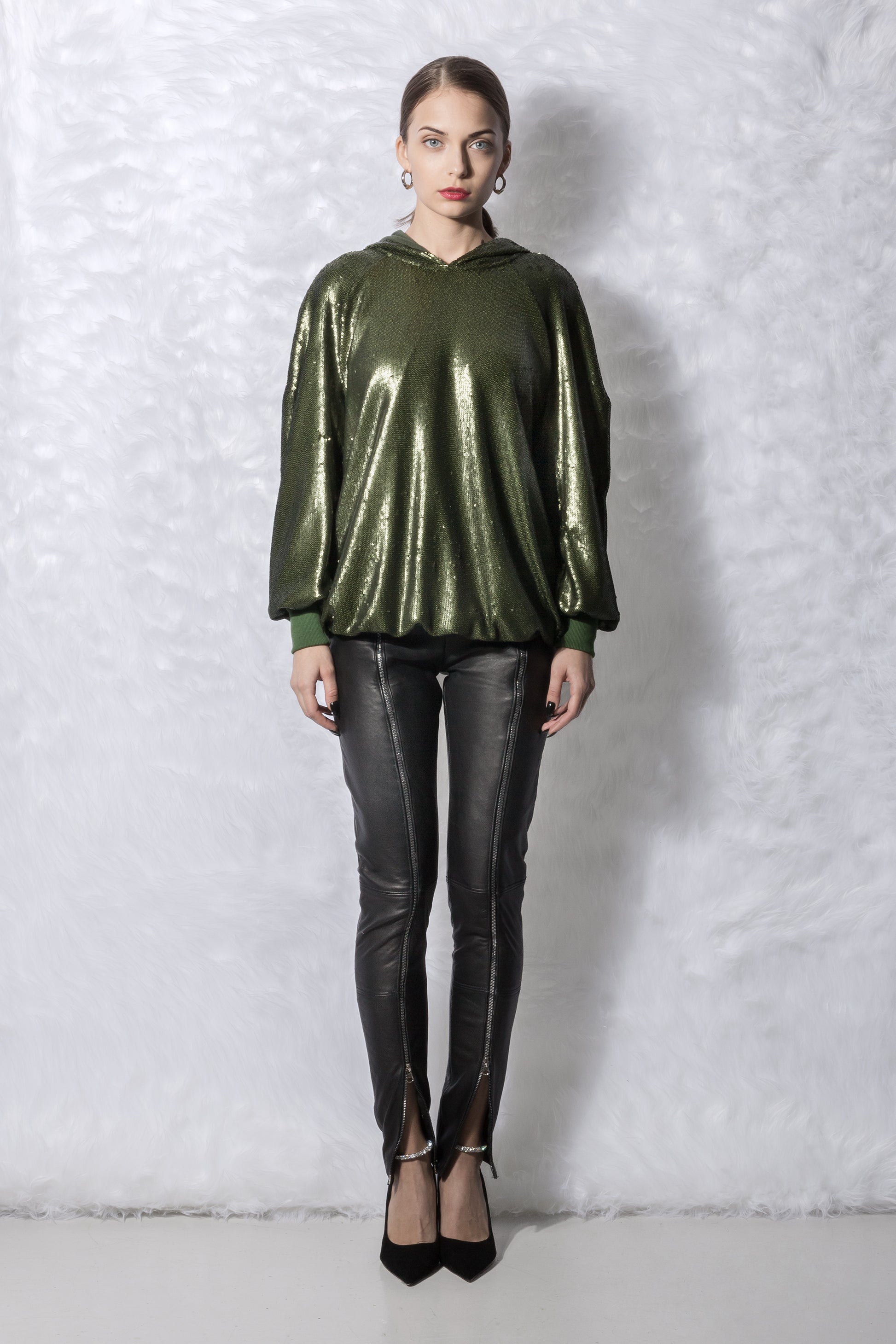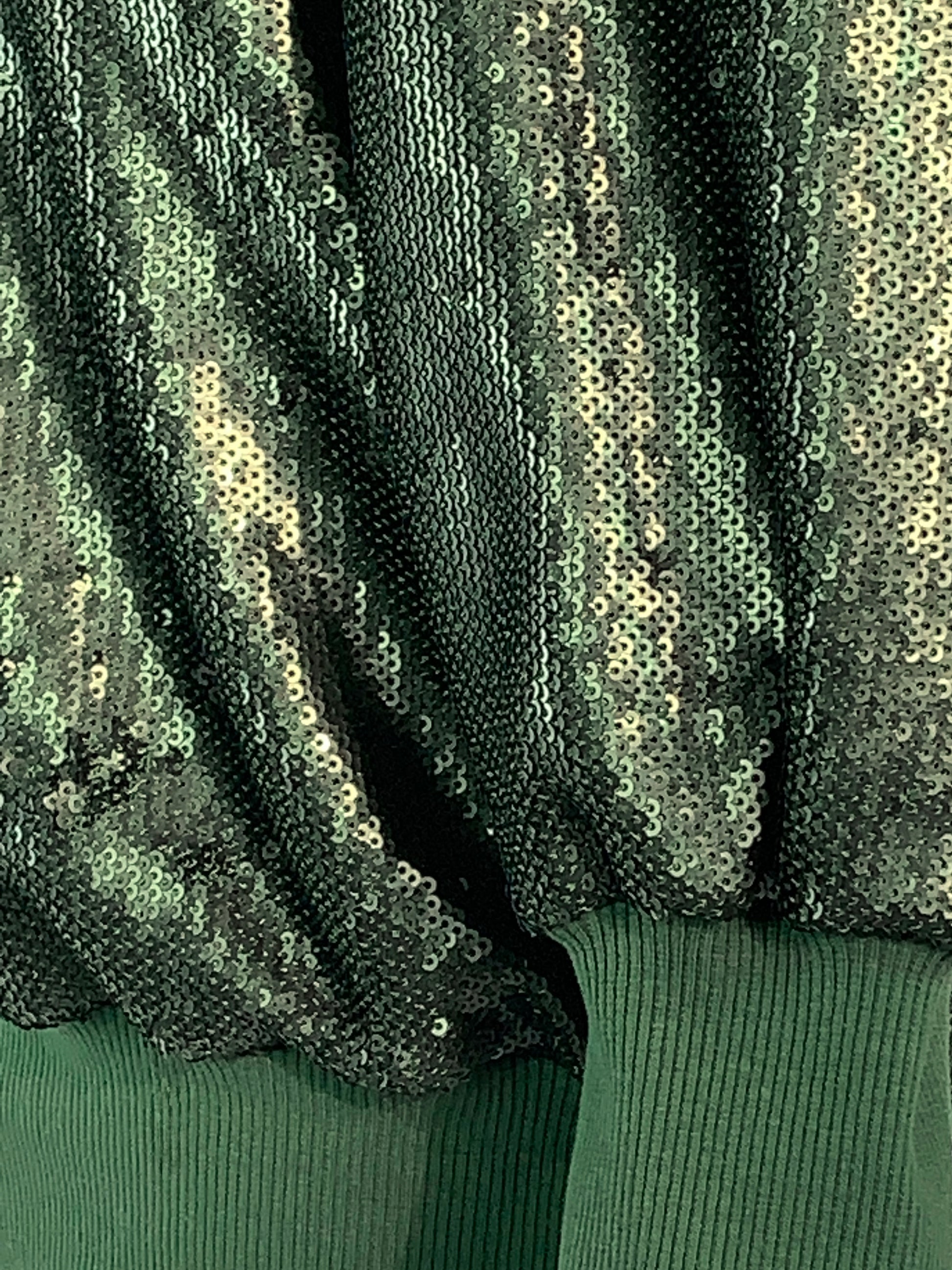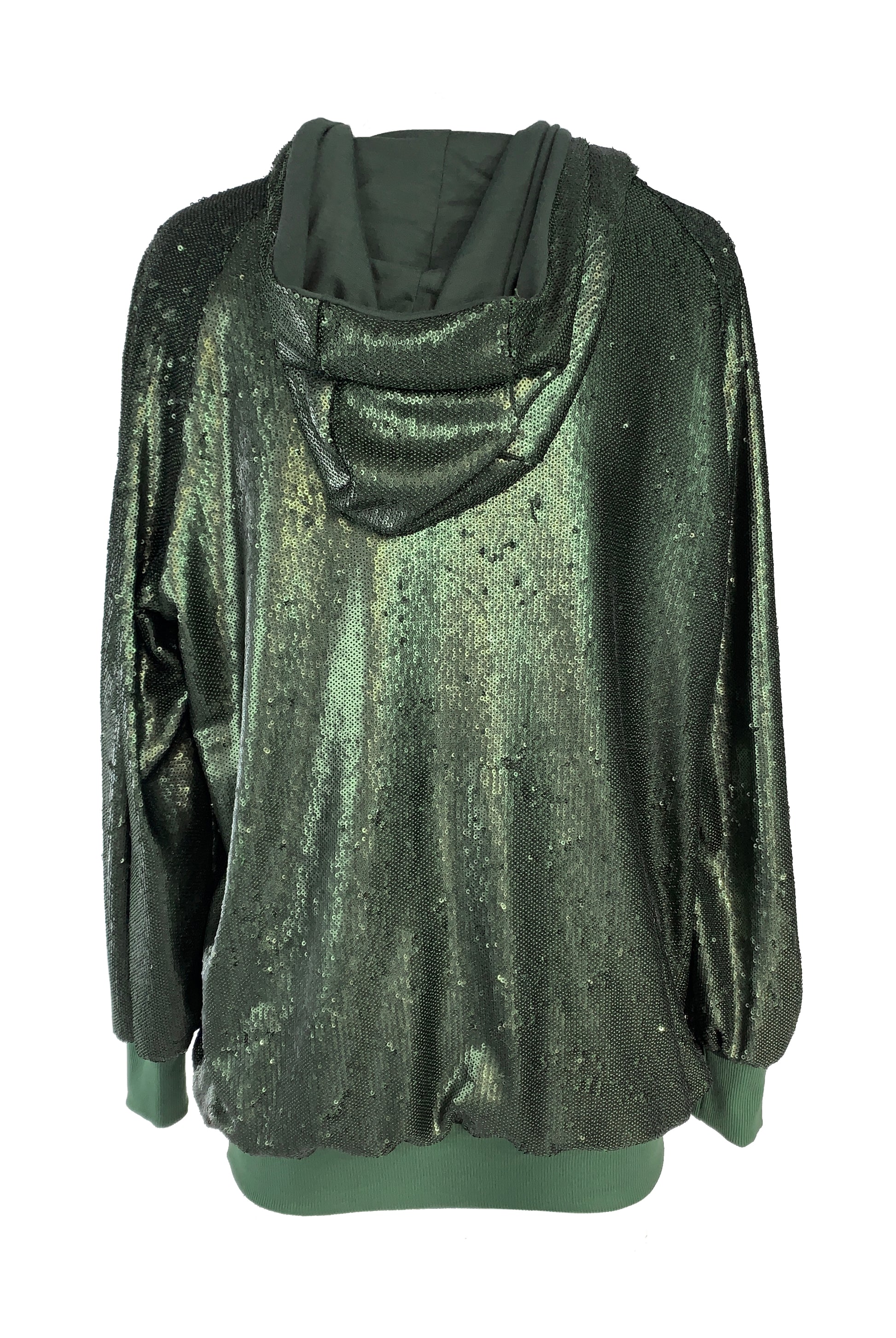 La sudadera con capucha verde con lentejuelas presenta una capucha clásica, mangas largas y adornos de lentejuelas por todas partes.
