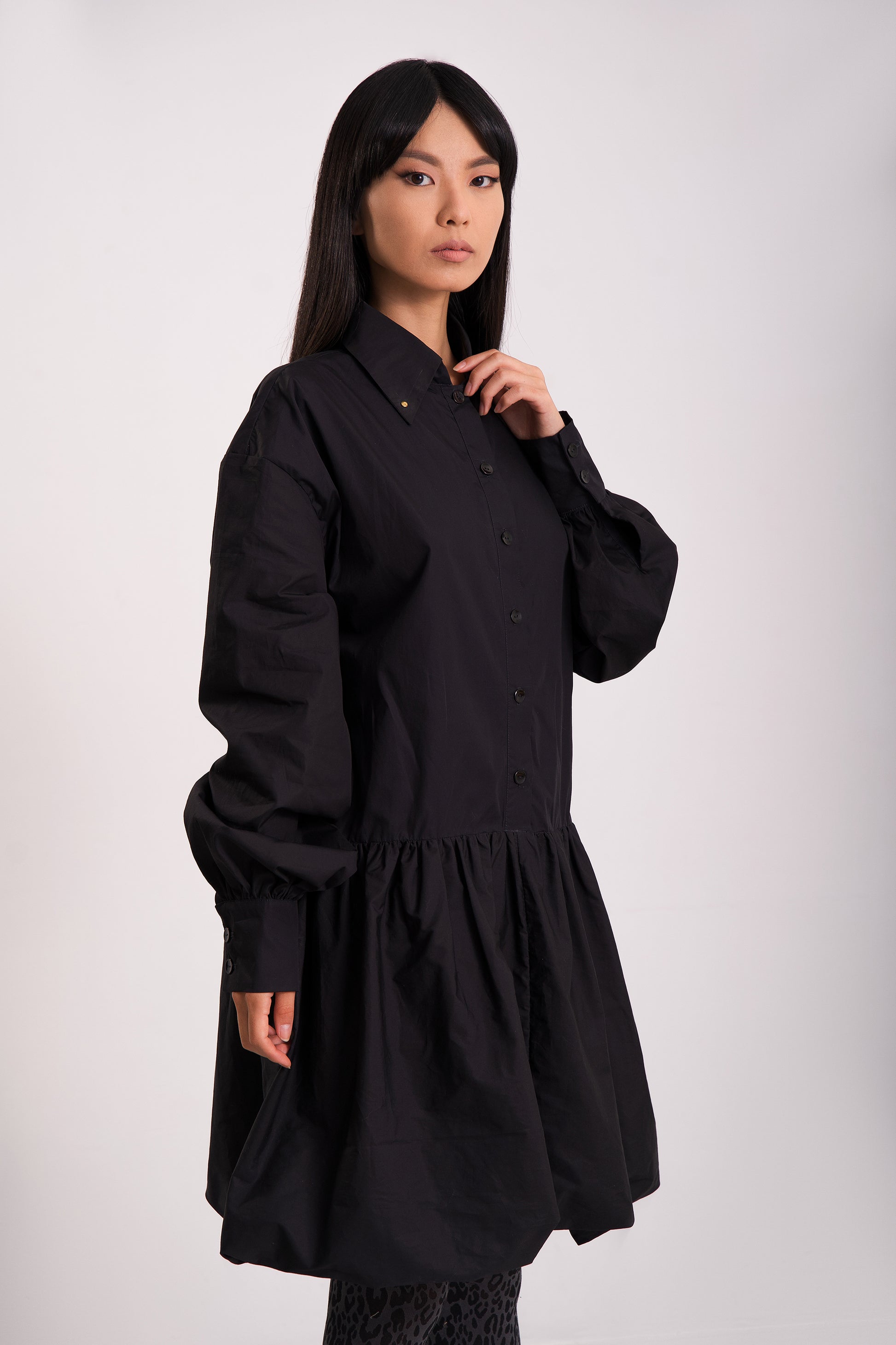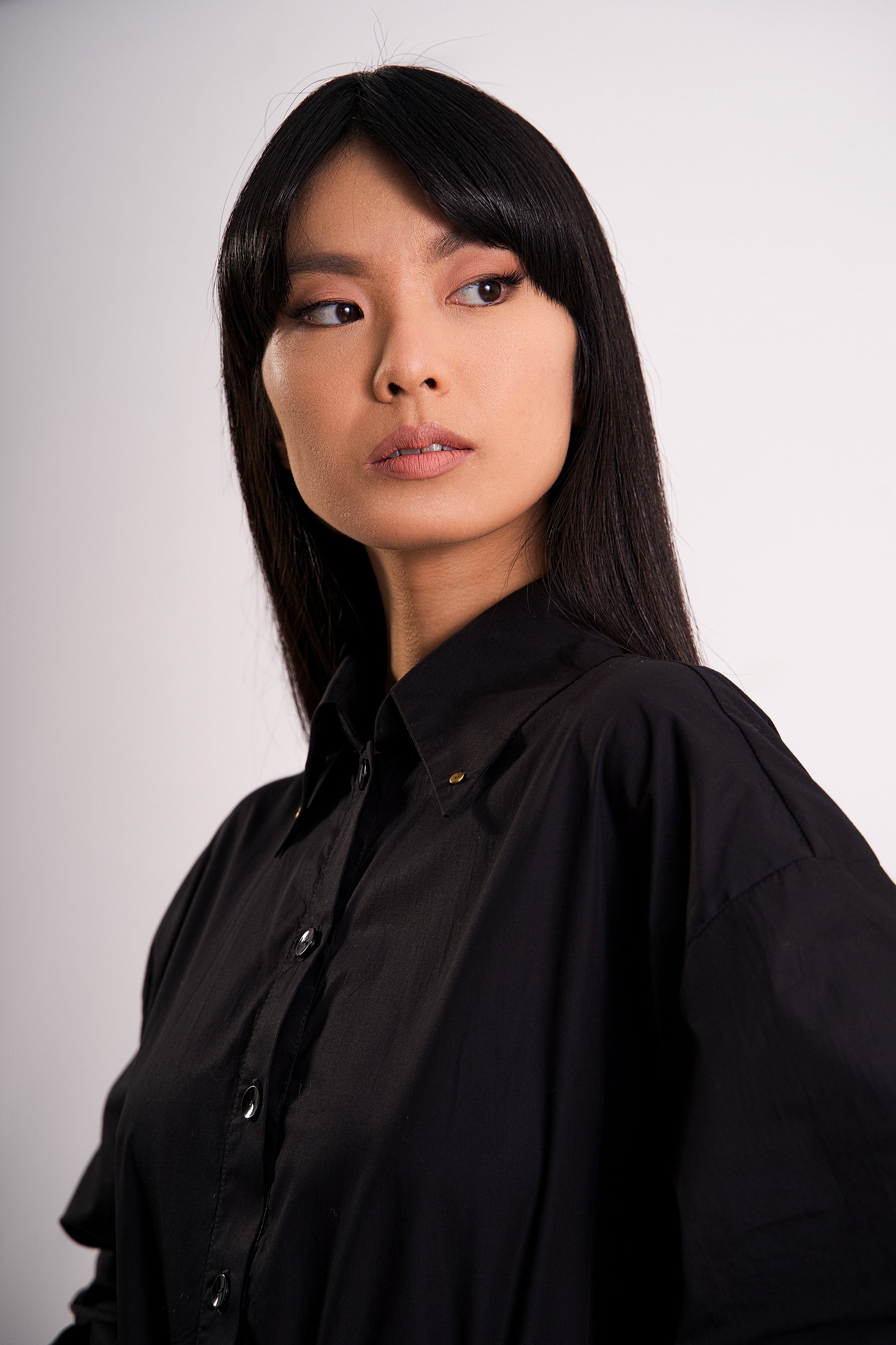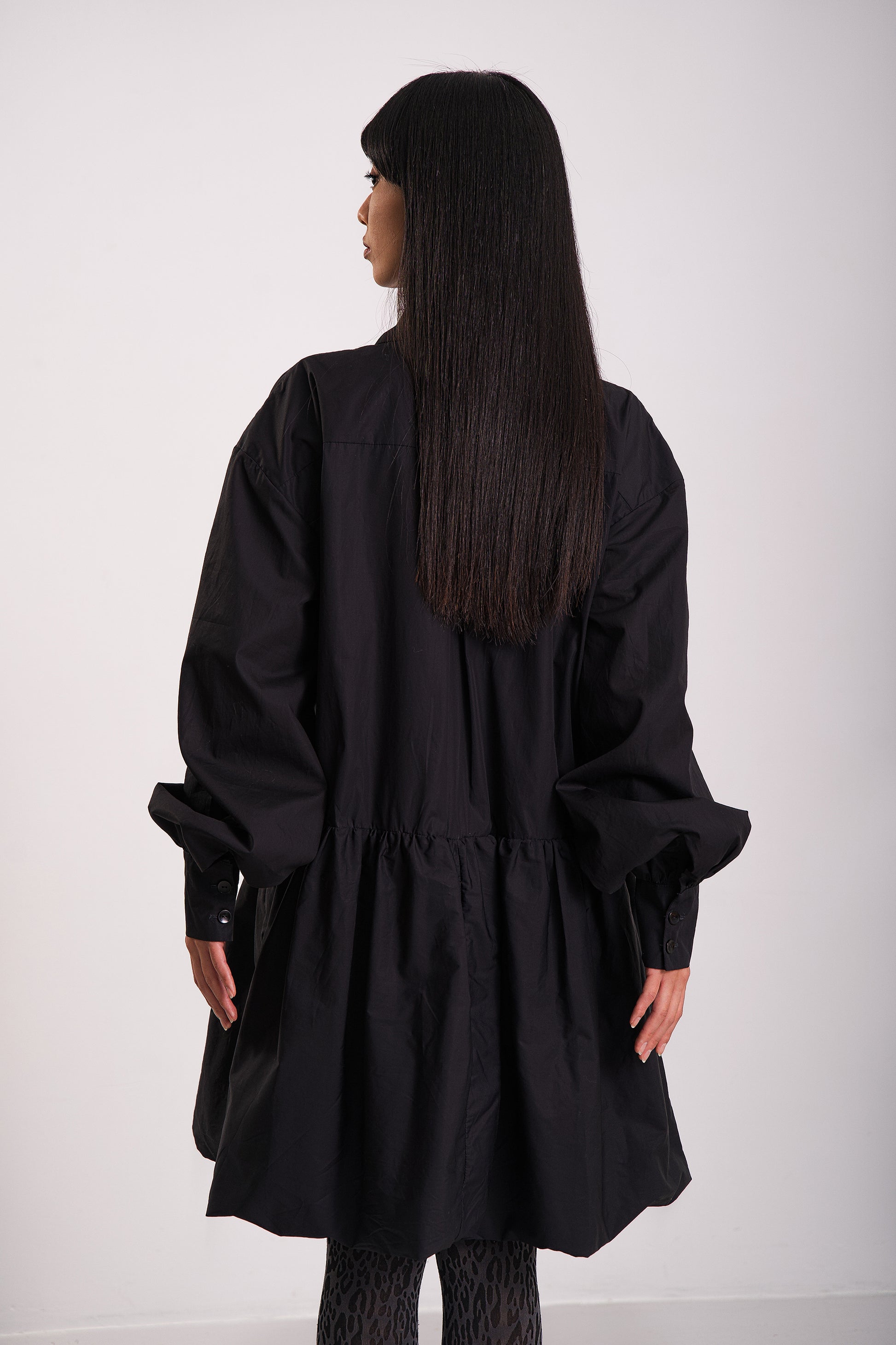 Esta camisa negra es un básico en tu armario. Tiene corte oversize, mangas largas y cierre de botones delanteros. Cuello clásico con detalles metálicos.