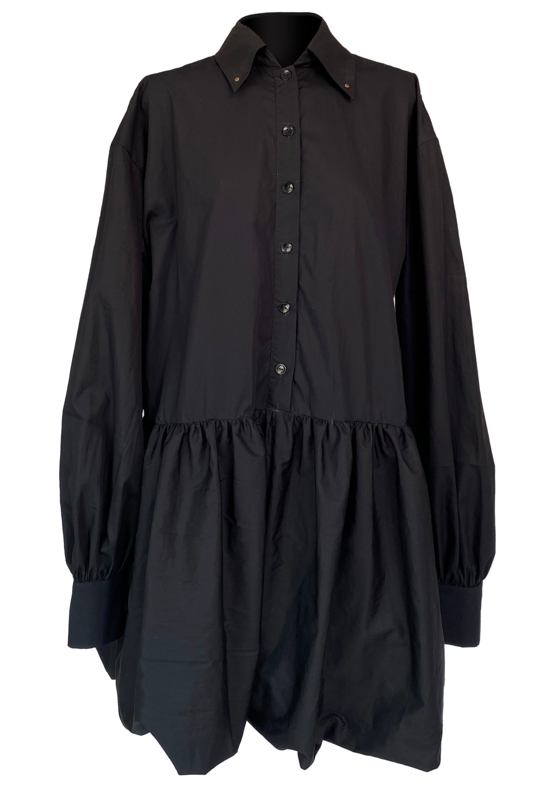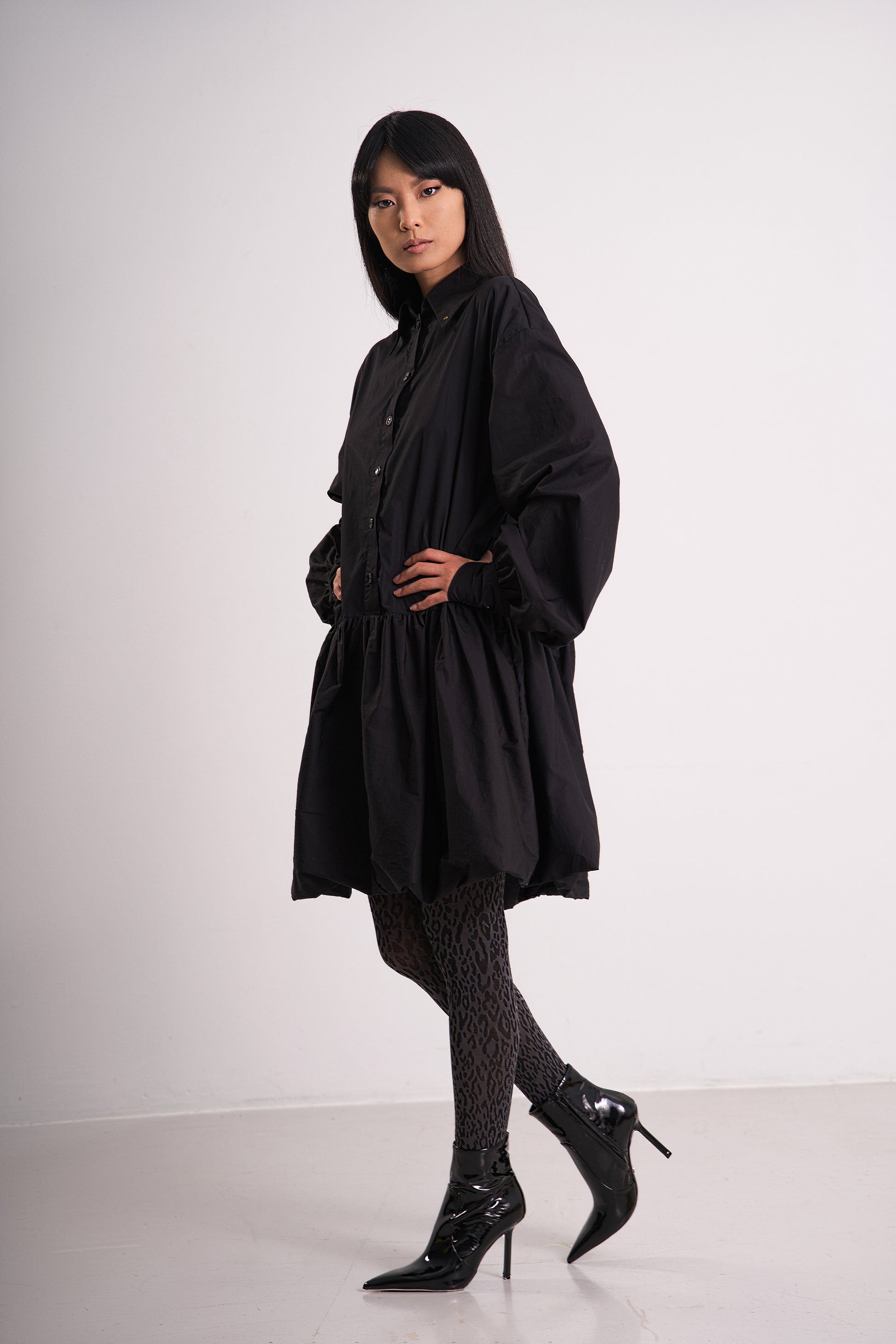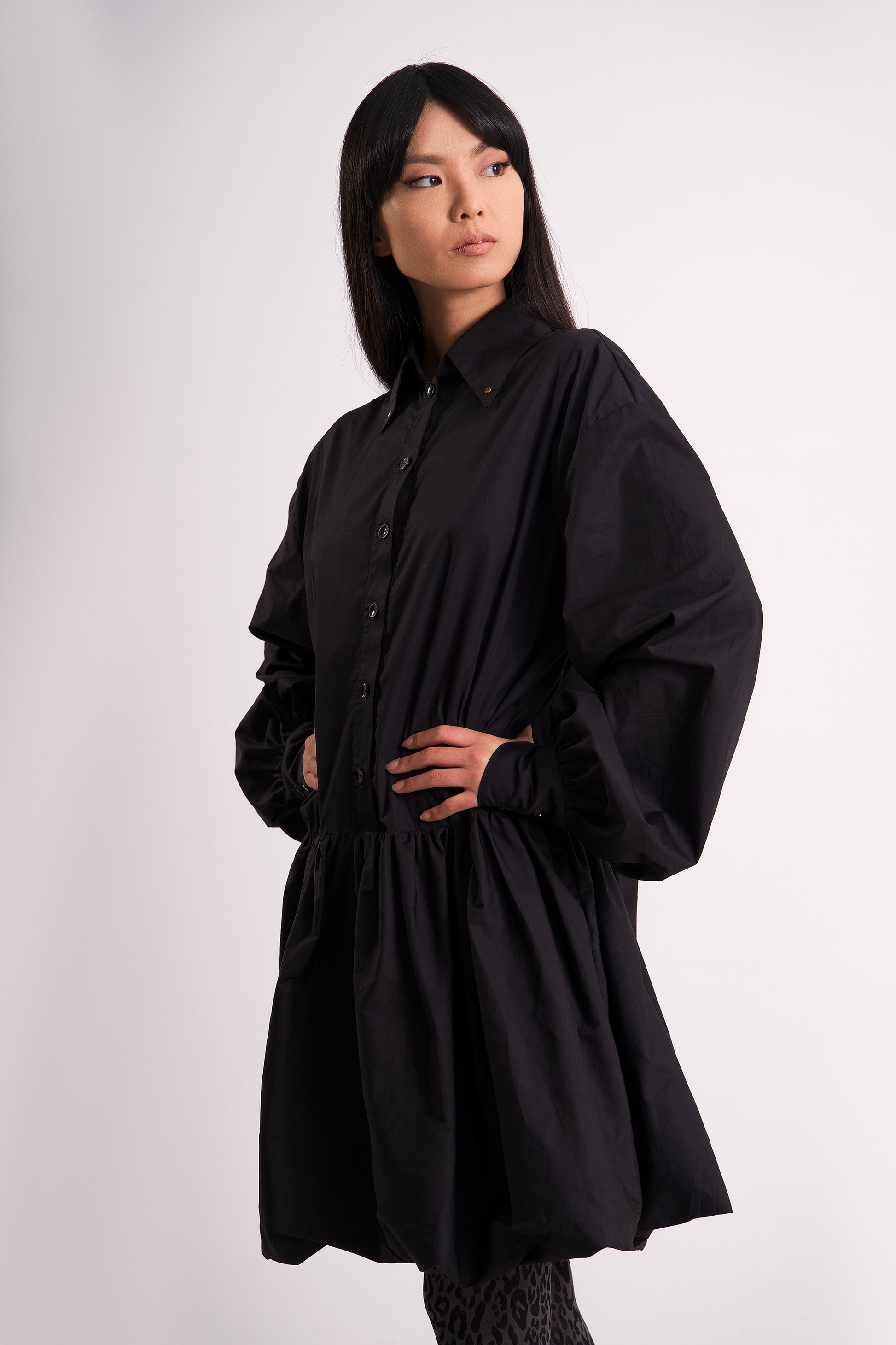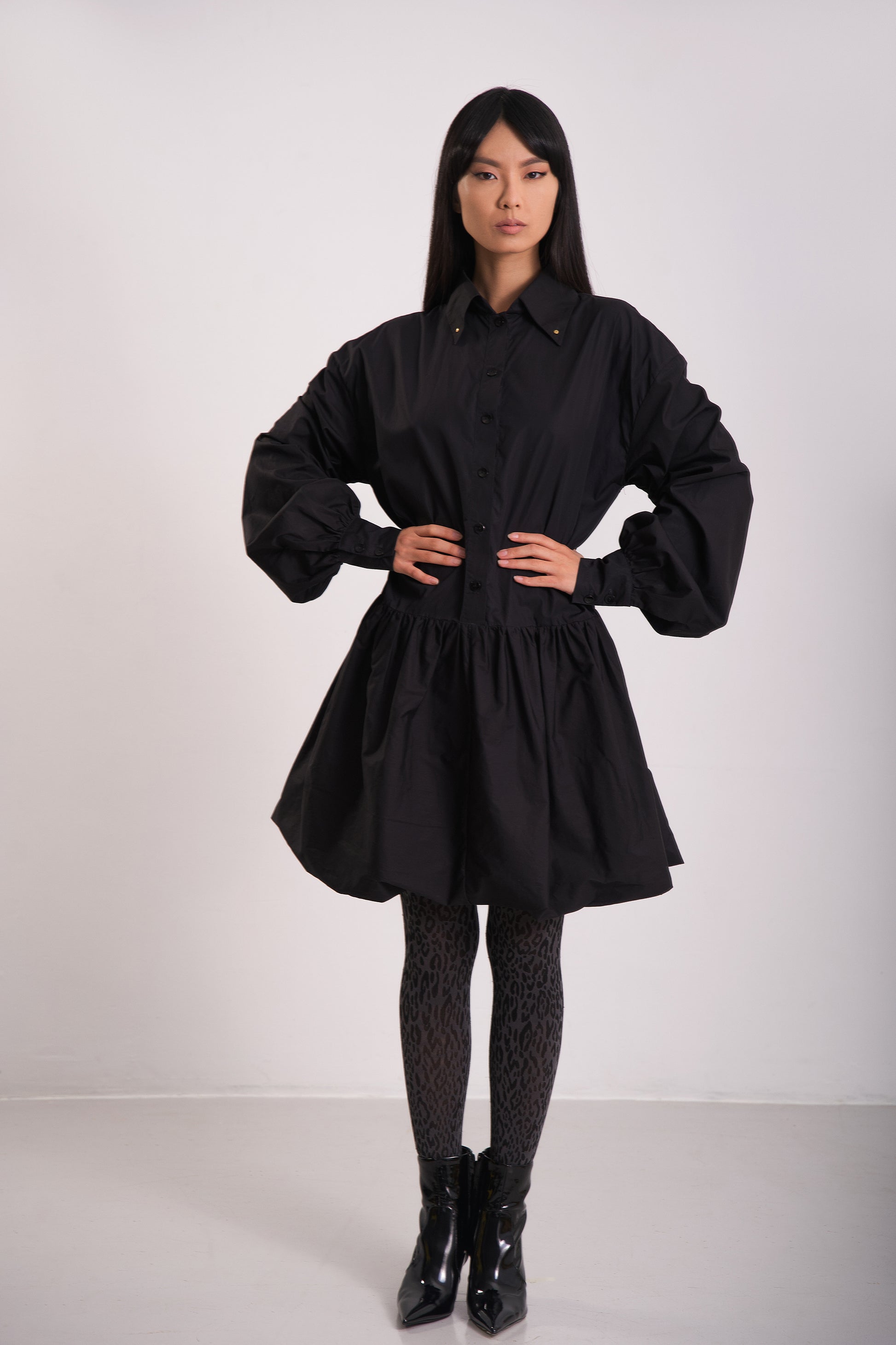Esta camisa negra es un básico en tu armario. Tiene corte oversize, mangas largas y cierre de botones delanteros. Cuello clásico con detalles metálicos.