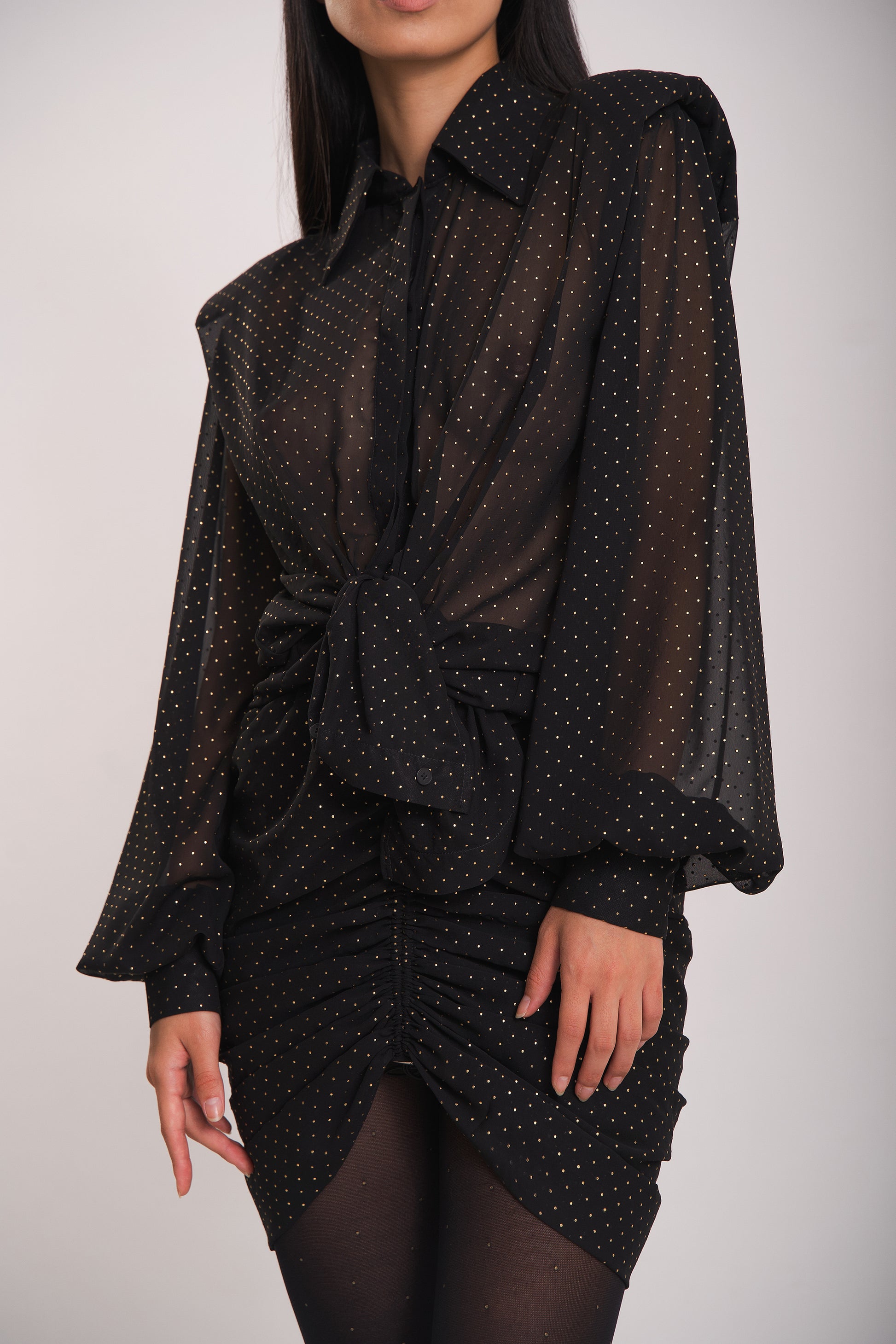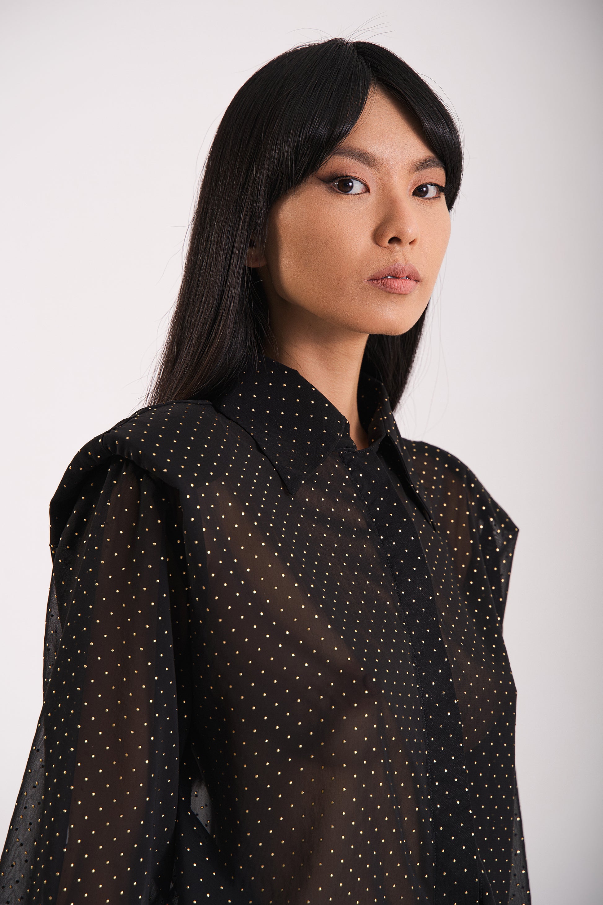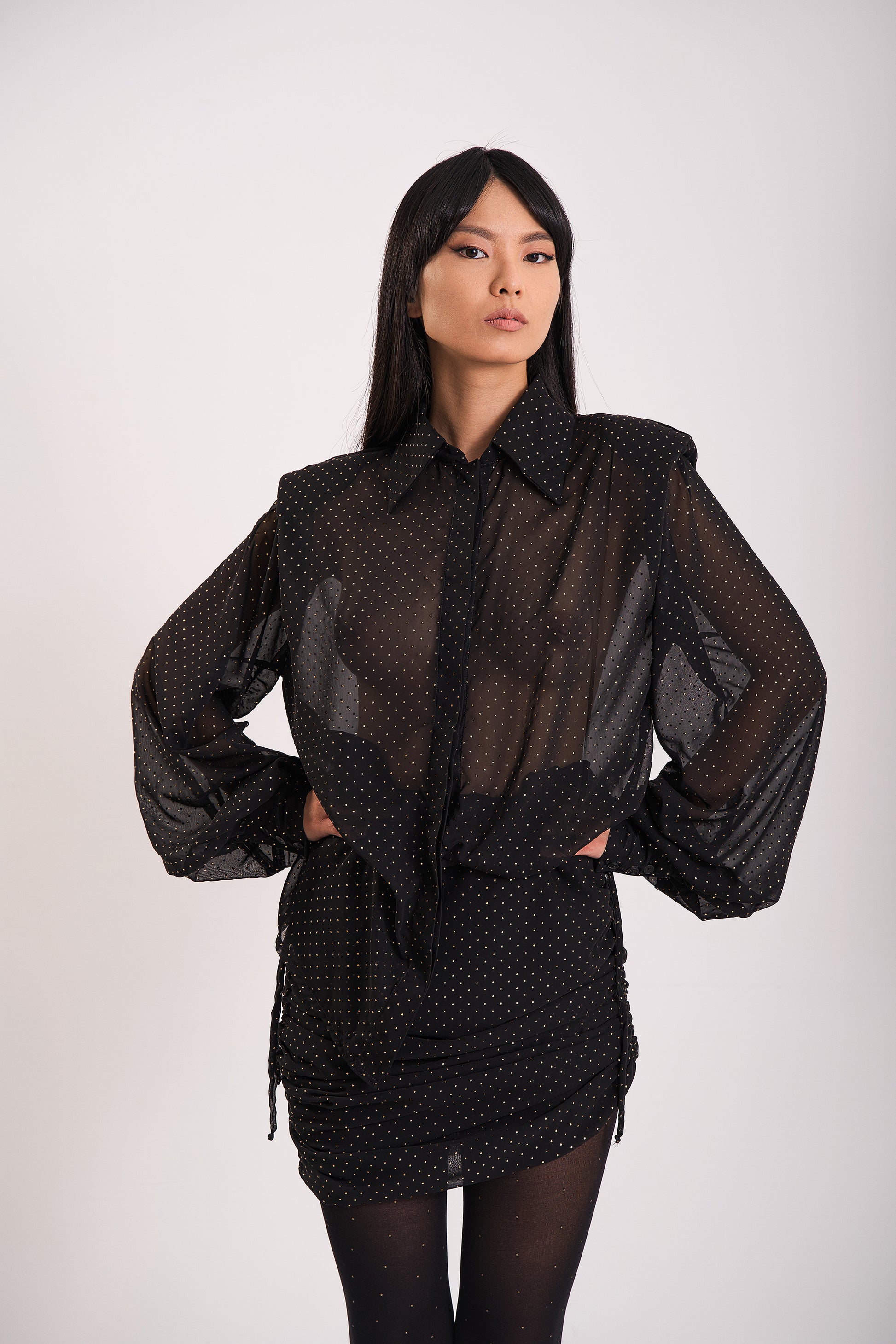 Esta blusa negra es un básico en tu armario. Tiene un corte oversize, mangas largas y cierre de botón. Cuello clásico.