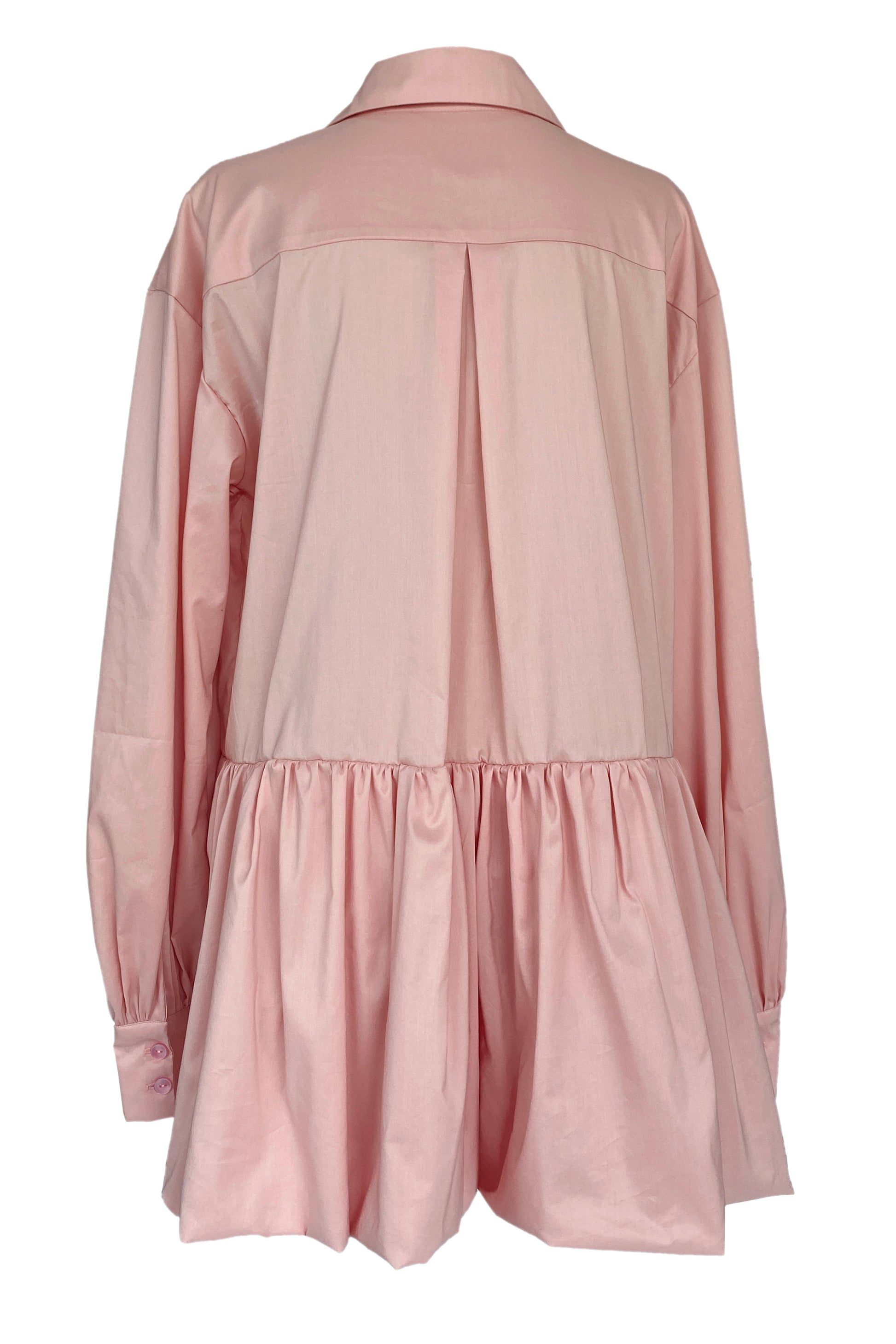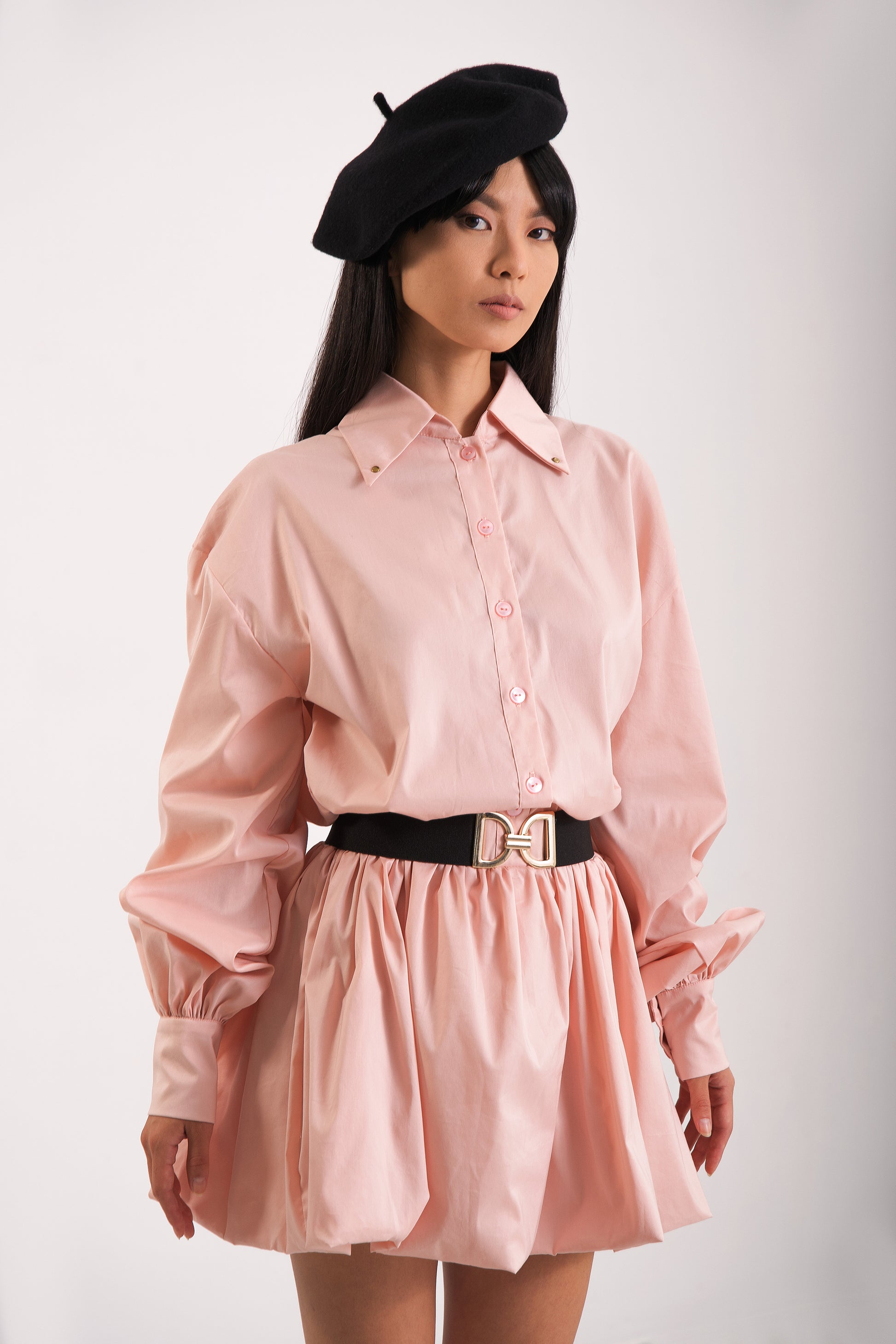 Esta camisa/vestido rosa es un básico en tu armario. Tiene un corte oversize, mangas largas y cierre de botones delanteros. Cuello clásico con detalles metálicos.