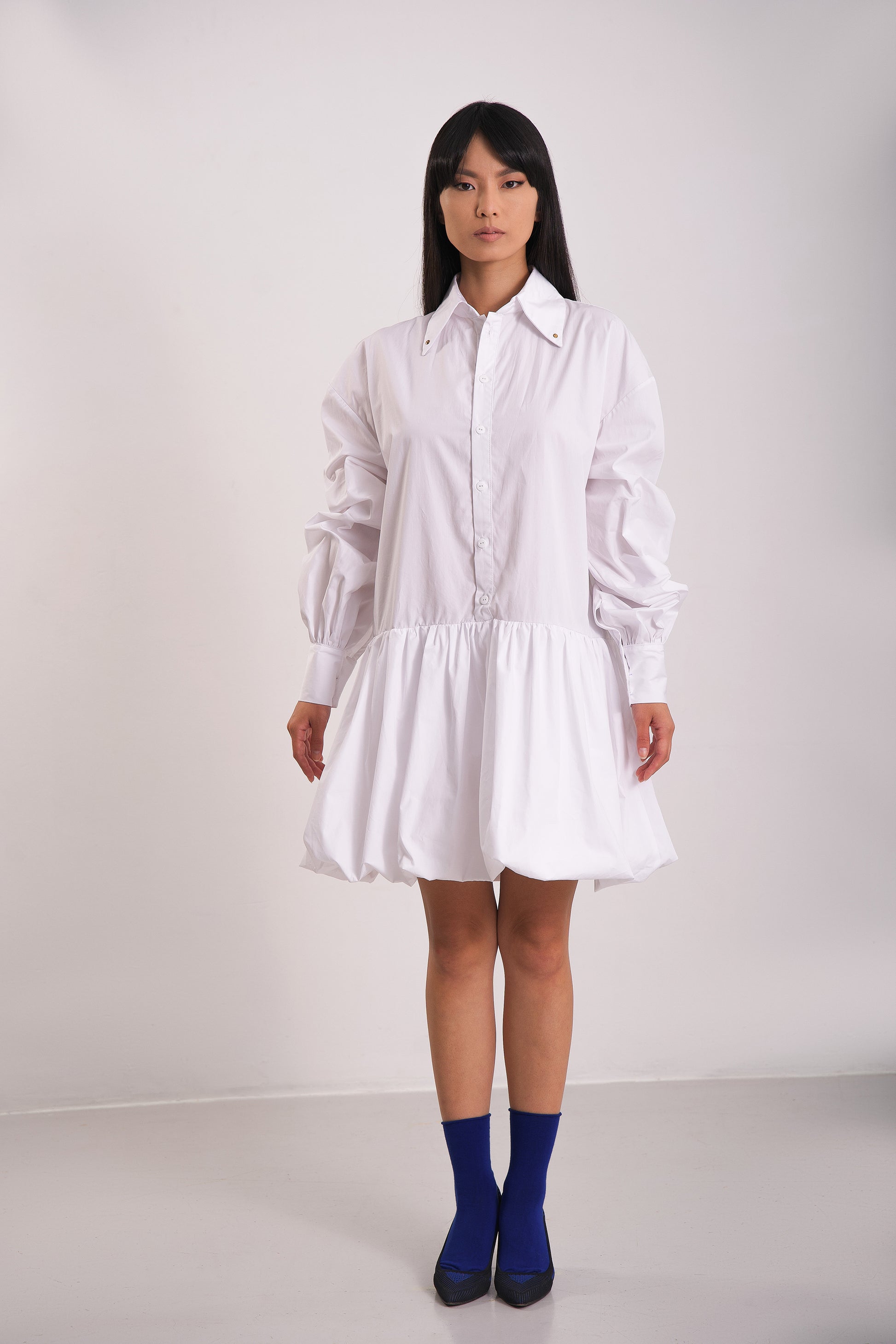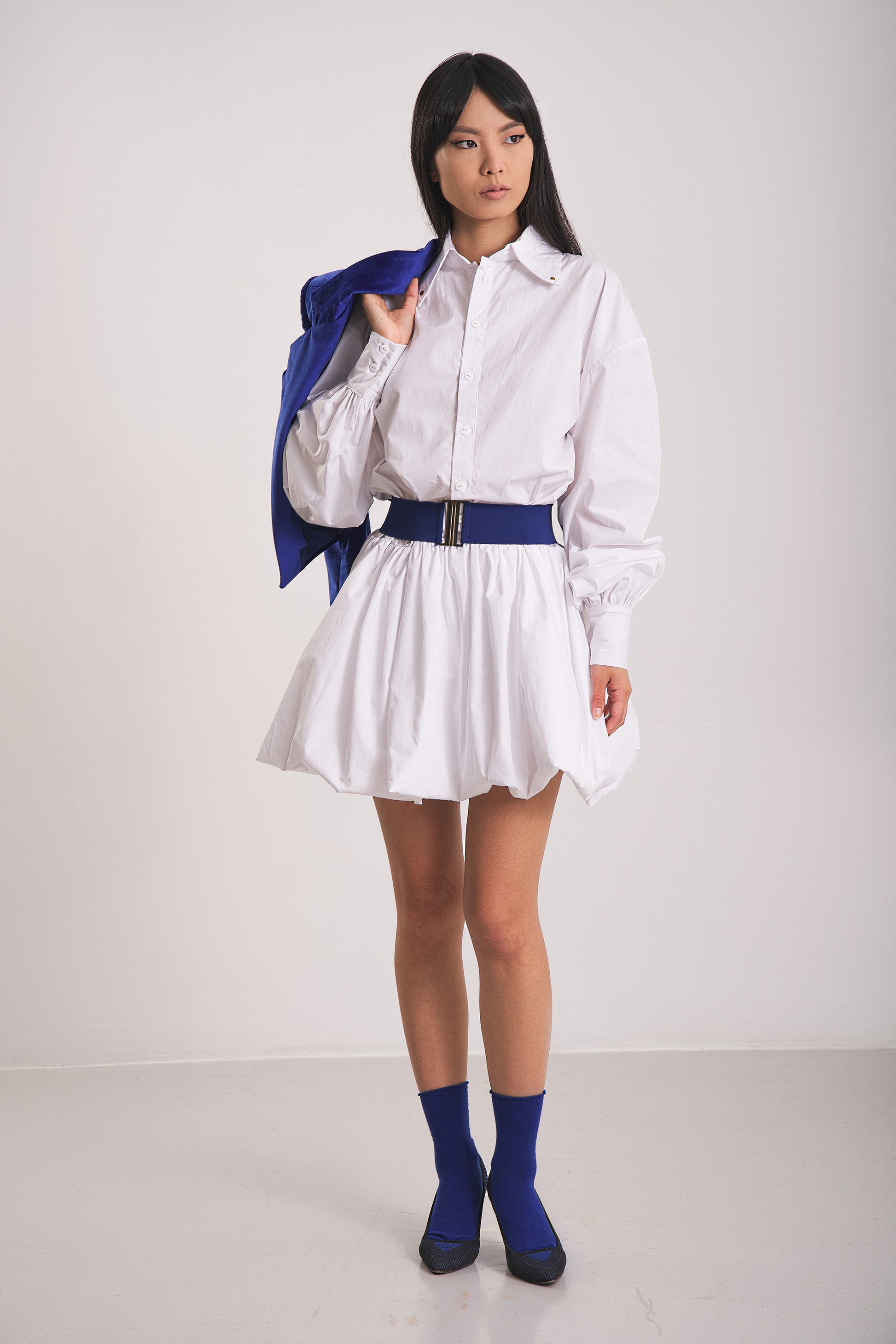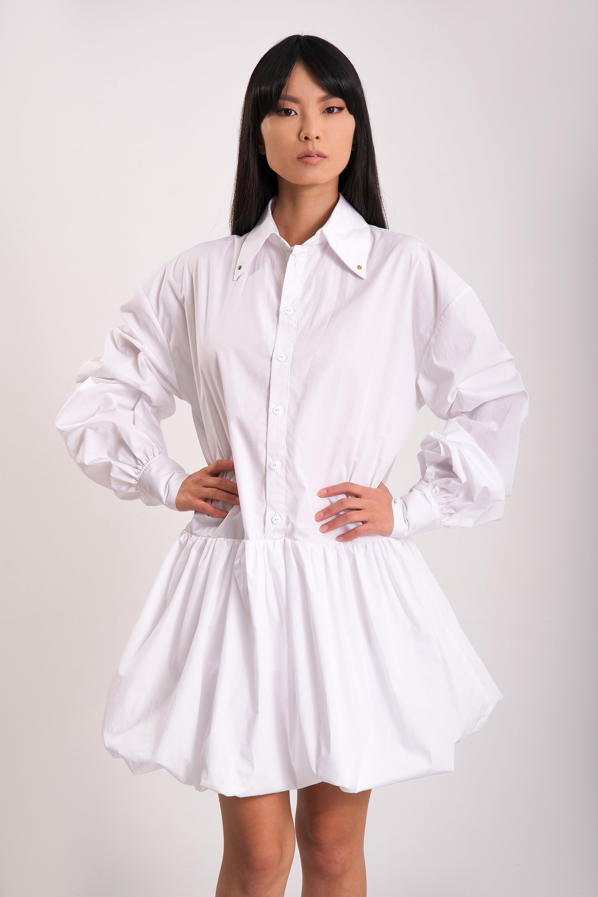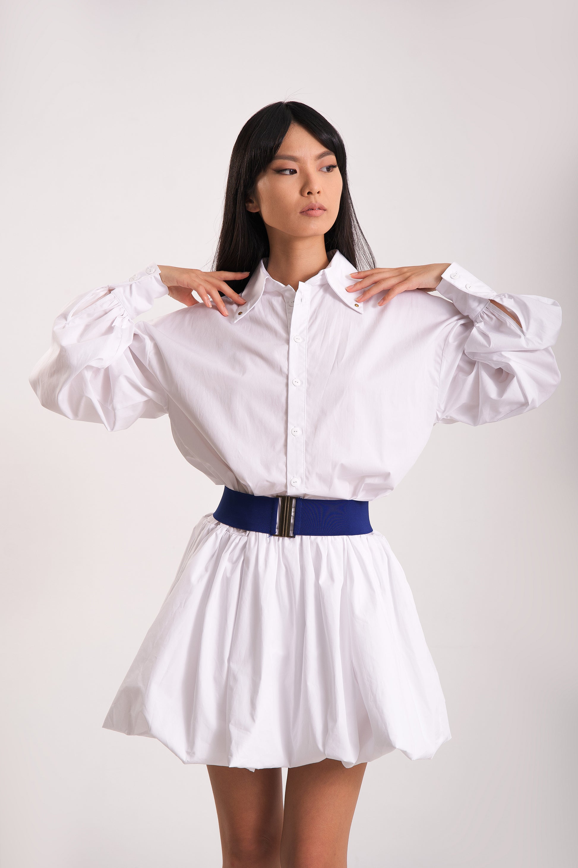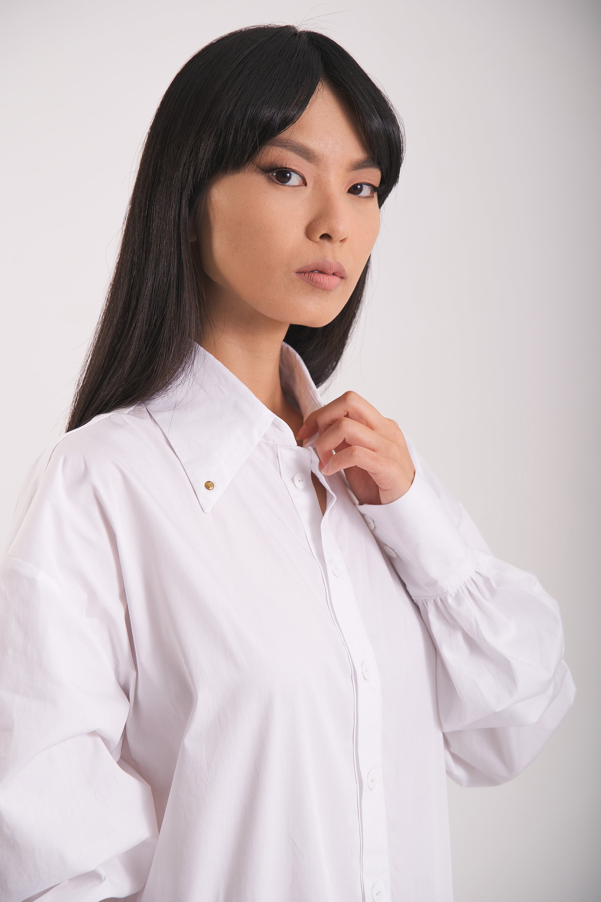 Esta camisa blanca es un básico en tu armario. Tiene corte oversize, mangas largas y cierre de botones delanteros. Cuello clásico con detalles metálicos.