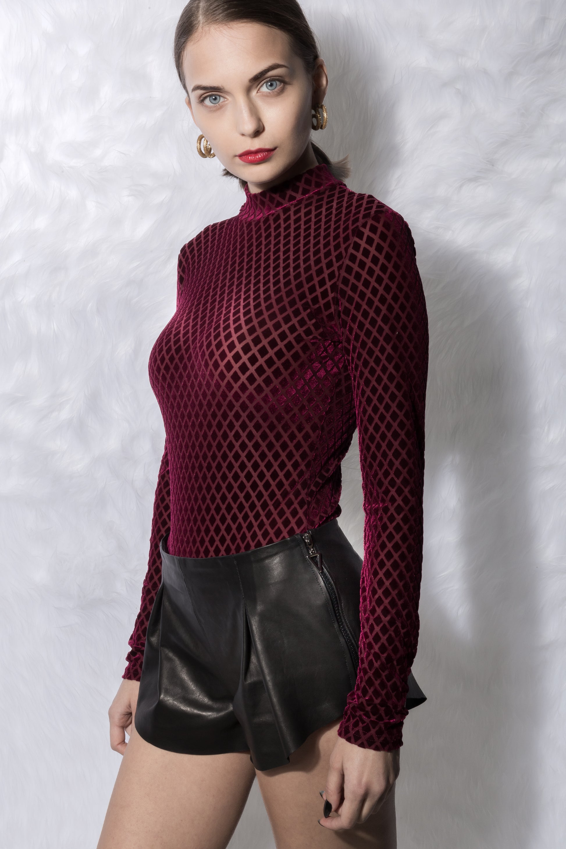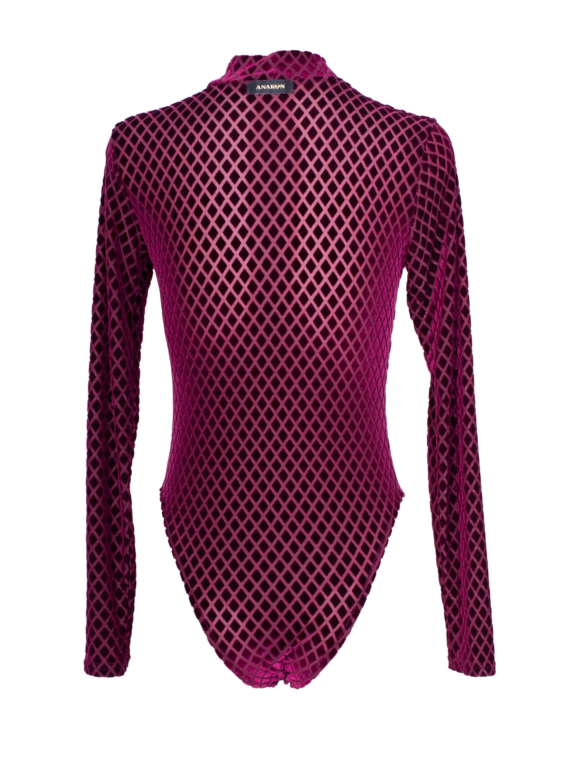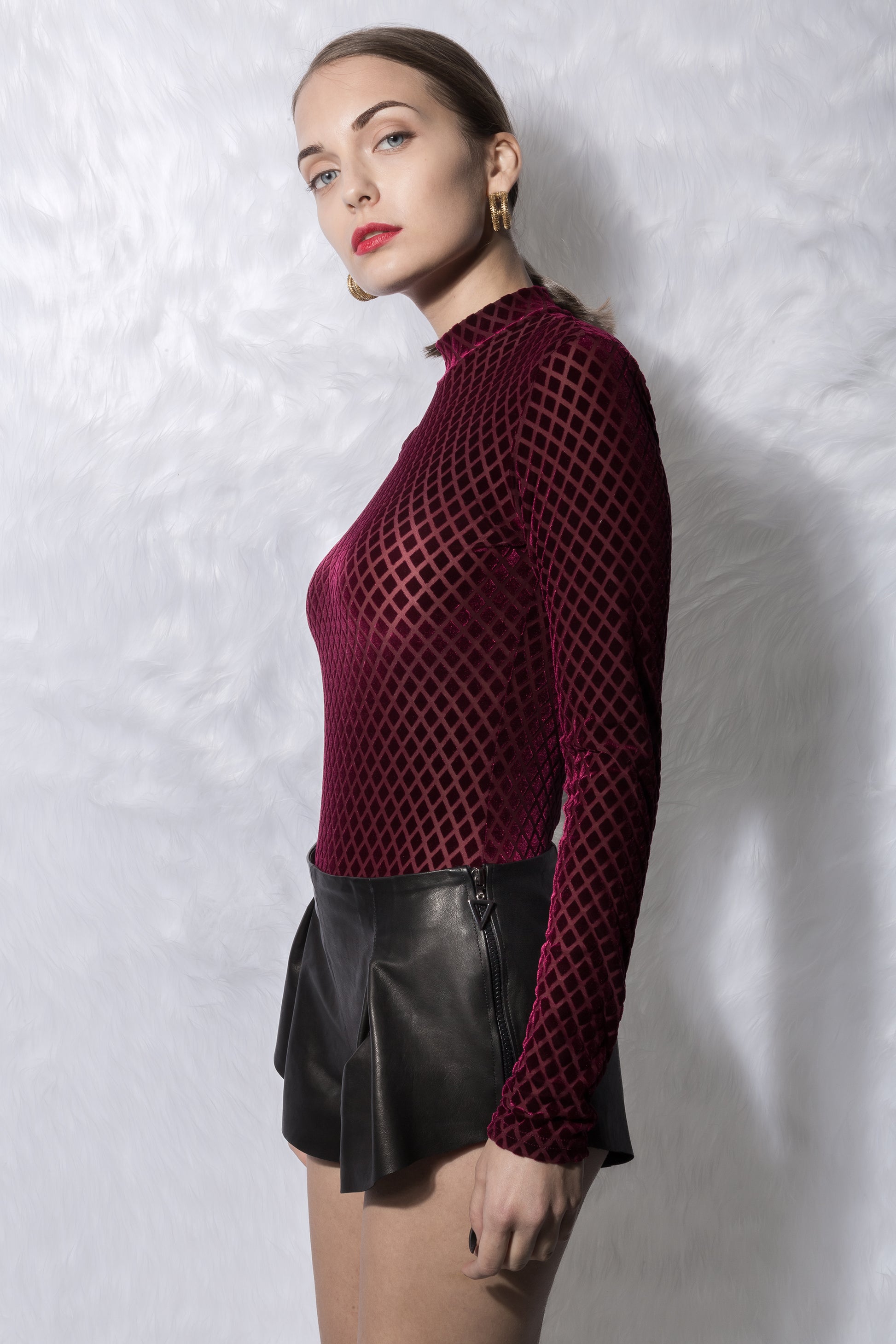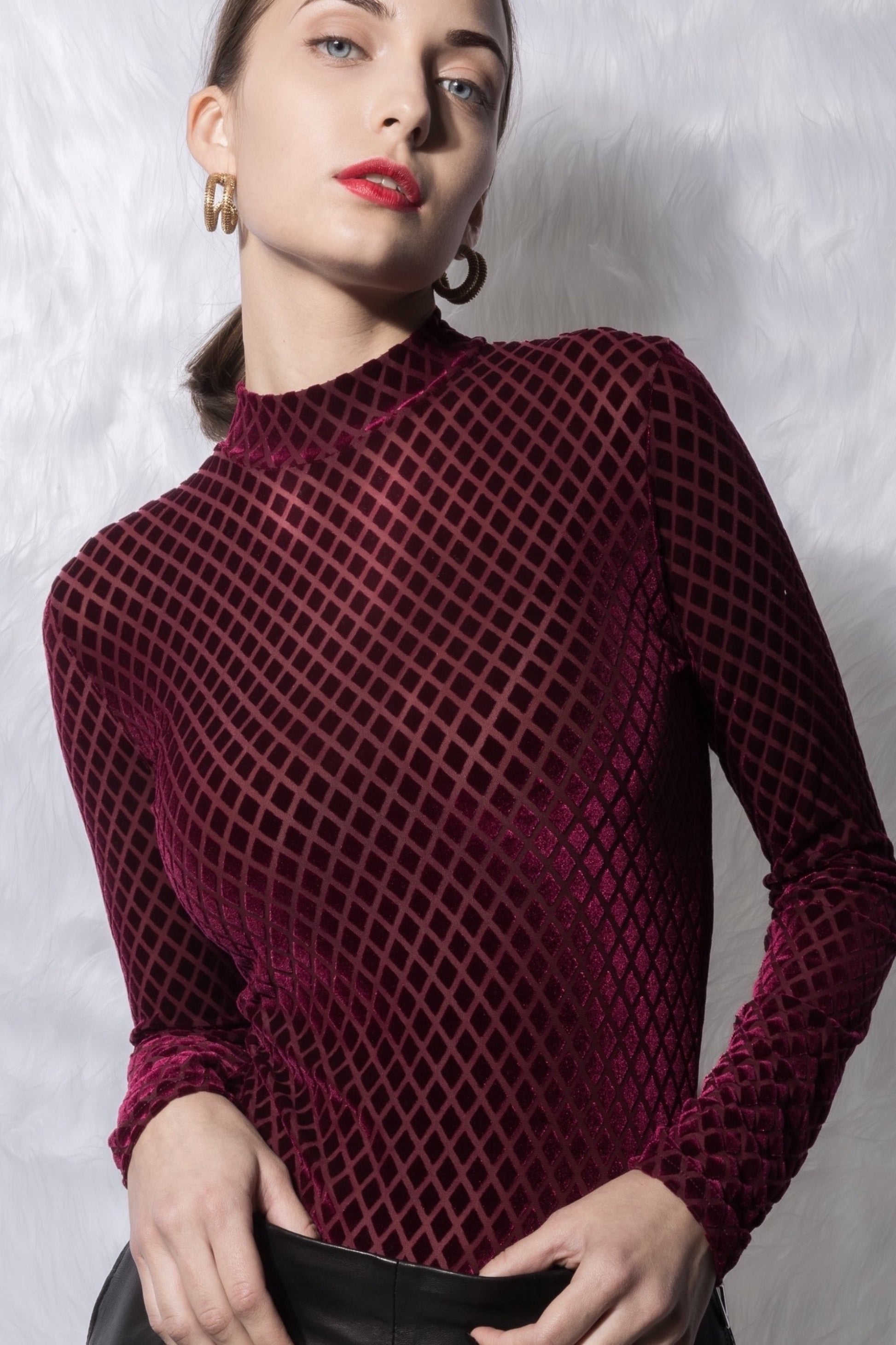 Body de terciopelo burdeos con cuello alto, silueta ajustada, mangas largas, diseño elástico y cierre de gancho y ojal.