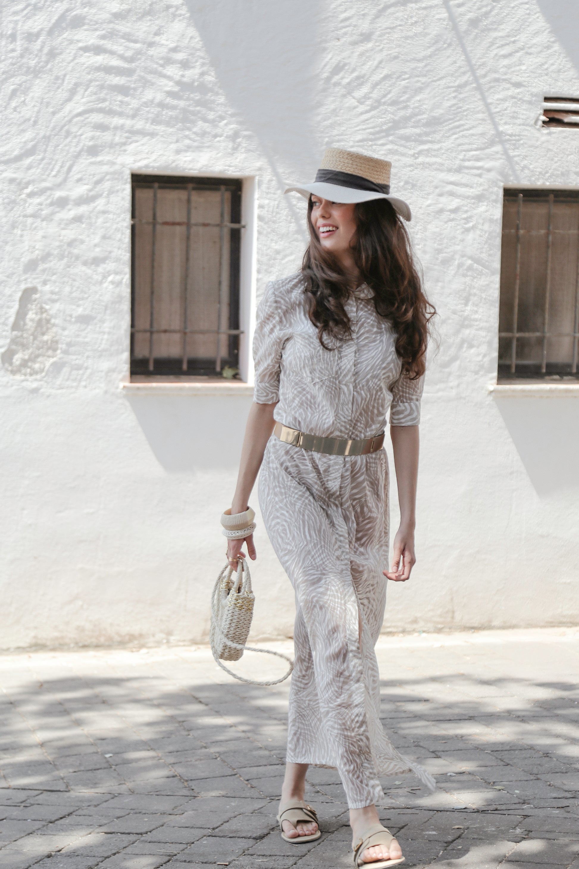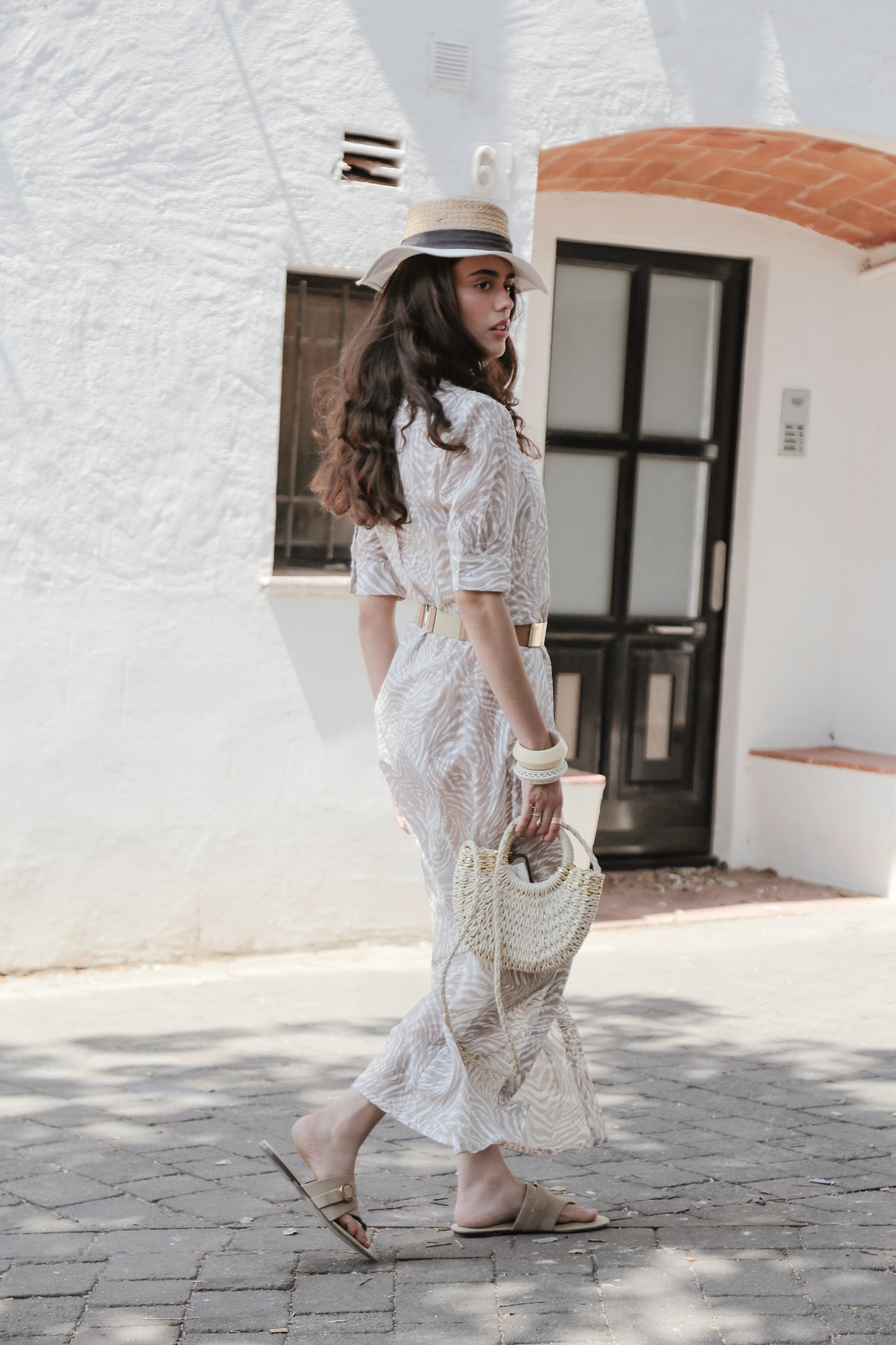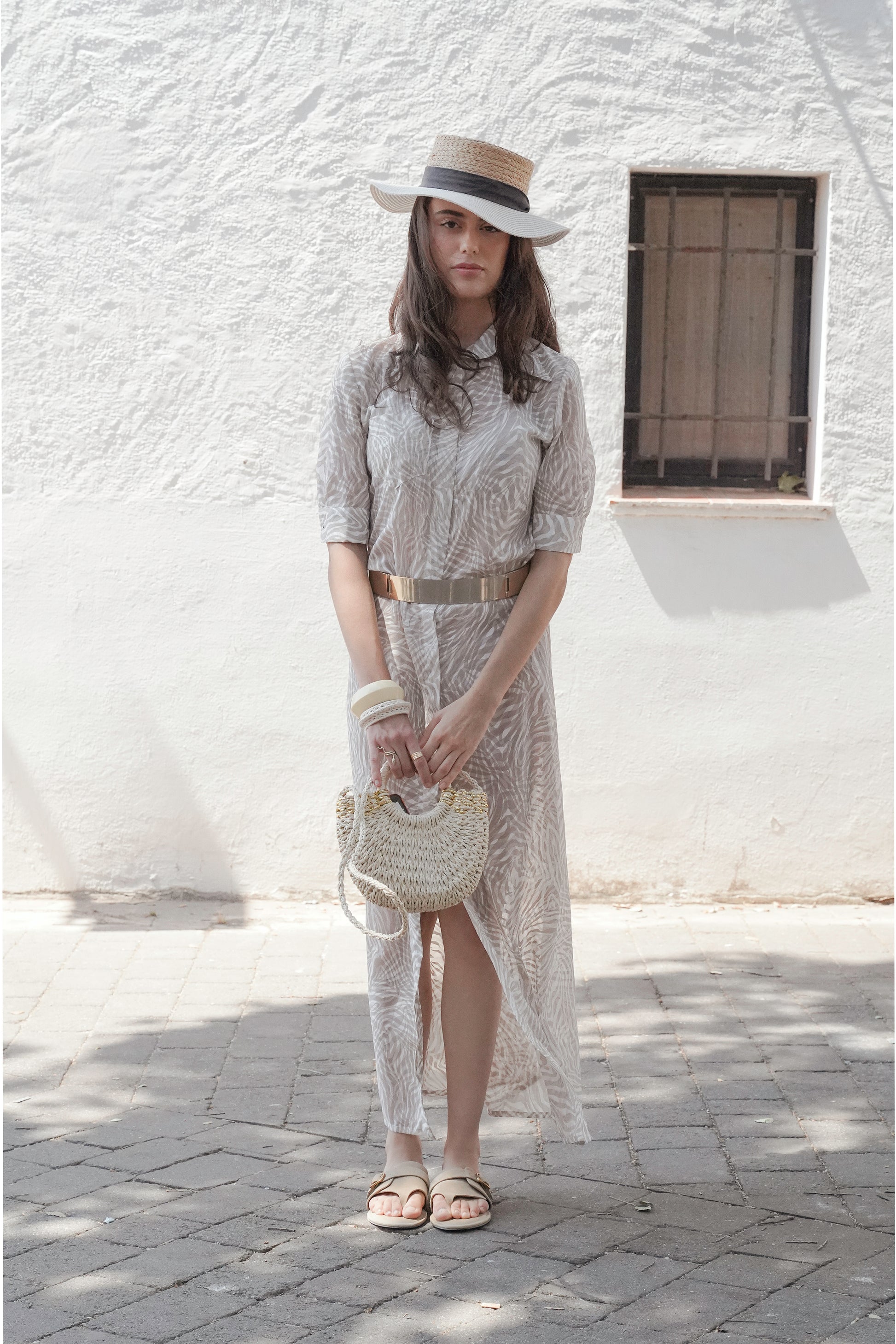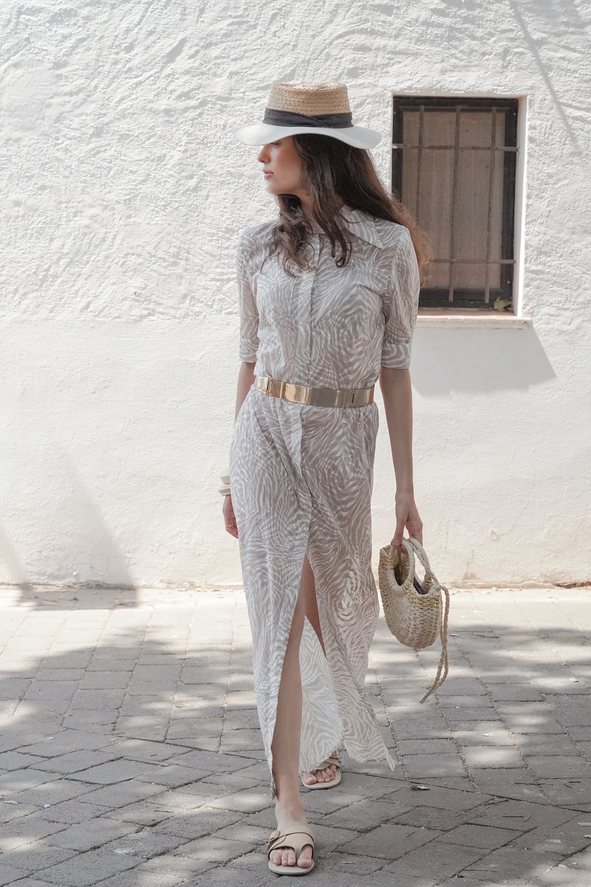 Este vestido camisero con estampado de cebra blanco irradia sofisticación, incluso en días más informales. Tiene cuello clásico, mangas cortas y se cierra con botones de concha en la parte delantera. Combínalo con un cinturón, un bolso y zapatos neutros.