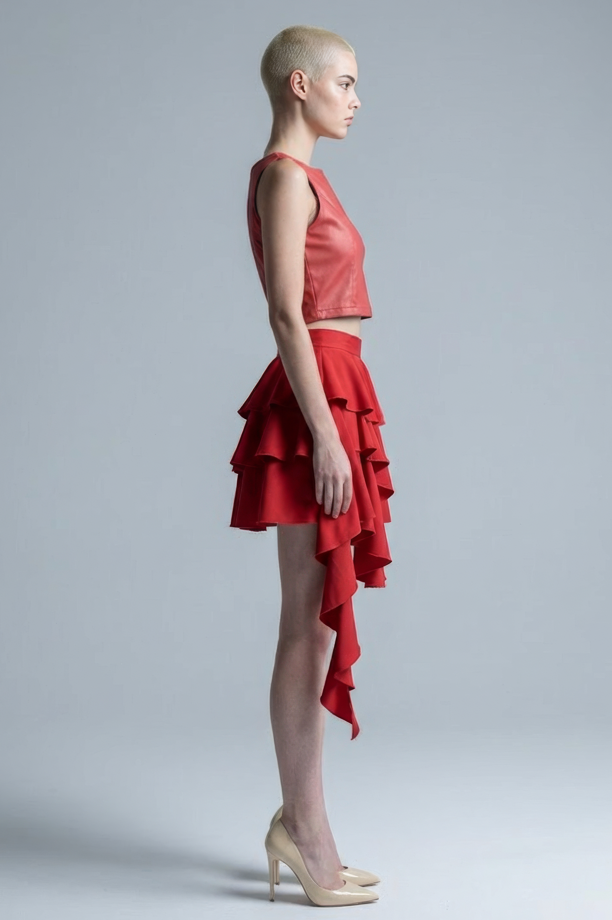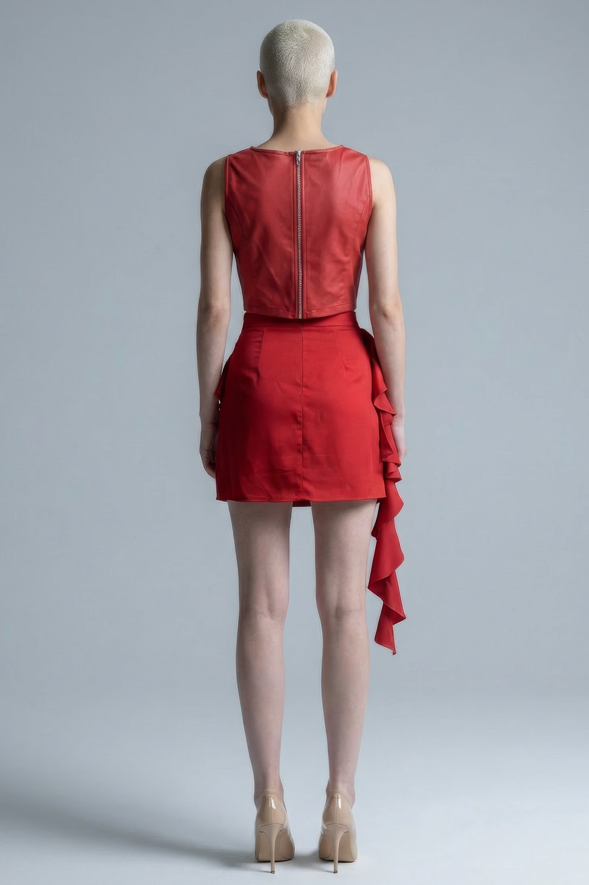 This red leather cropped top is defined by its clean lines and structured silhouette, designed to highlight the upper body with a refined yet contemporary attitude. Crafted in genuine leather with a smooth, natural finish, the sleeveless cut and precise tailoring create a strong yet elegant shape. The cropped length enhances the waist, making it an ideal piece to pair with high-waisted skirts or trousers. Bold, modern, and versatile, this top works effortlessly as a statement piece on its own or as part of a coordinated set for a powerful, fashion-forward look.