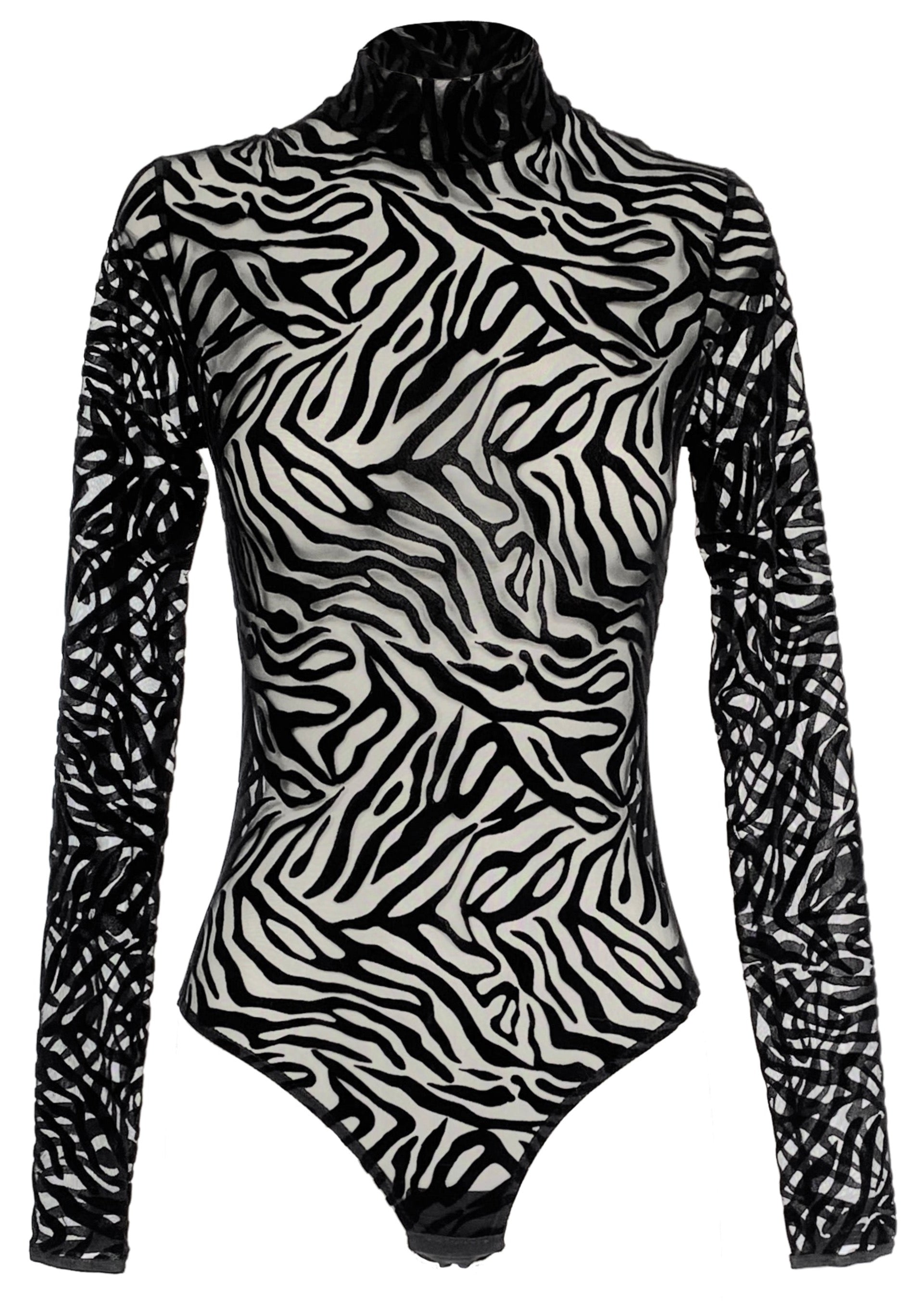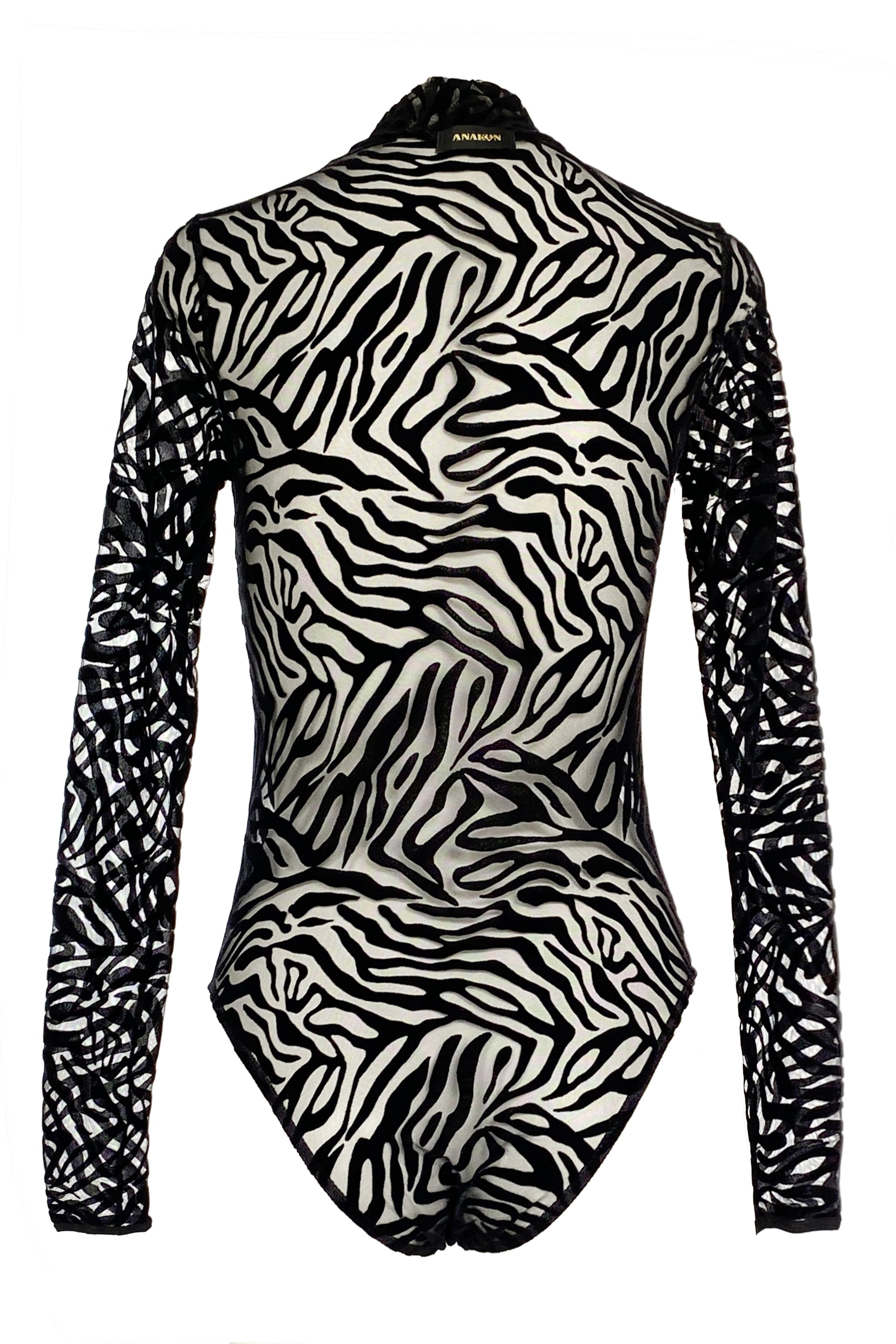 ANAKON presents black zebra print bodysuit featuring a round roll neck, long sleeves, a fitted stretch silhouette and hook and eye fastening.